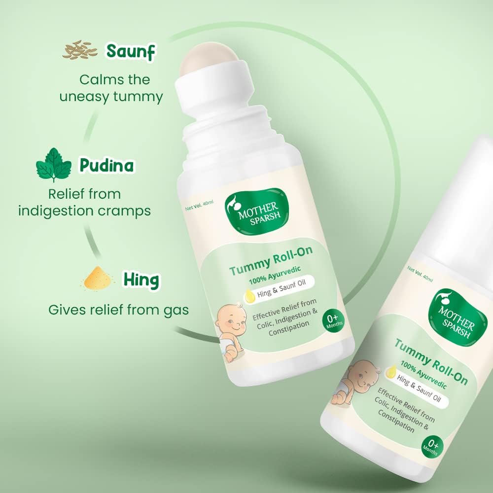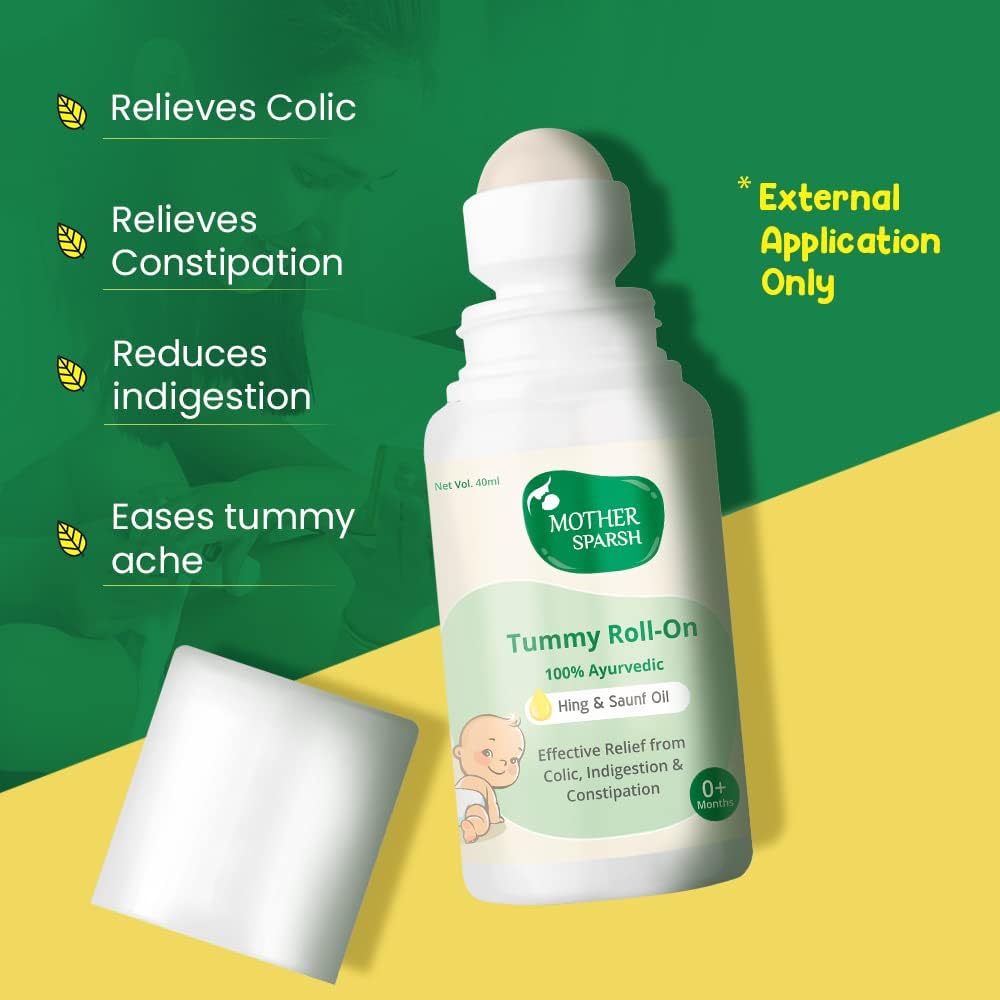 Relieves Stomach Discomfort: - Mother Sparsh Tummy Roll On is an Ayurvedic solution for babies suffering from colic, indigestion and constipation10Relieves Gas Pain: - As per our Ancient Ayurveda Hing (Asafoetida) helps to treat abdominal colic, gas, flatulence & indigestion. It also cures abdominal pain, constipation & upset stomach101010