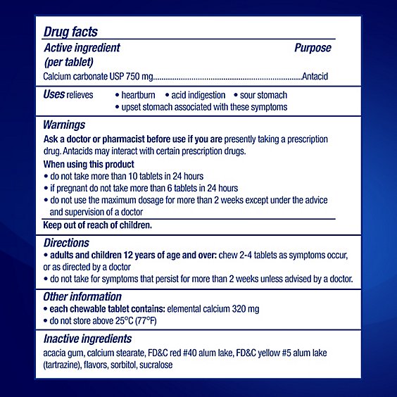 Tums Extra Strength Chewable Tablets provide fast relief of occasional heartburn, acid indigestion, and upset stomach. Each tablet contains 750 mg of calcium carbonate, an effective antacid that works quickly while also delivering a source of calcium. Delicious assorted berries flavor makes them easy to take anywhere, anytime.