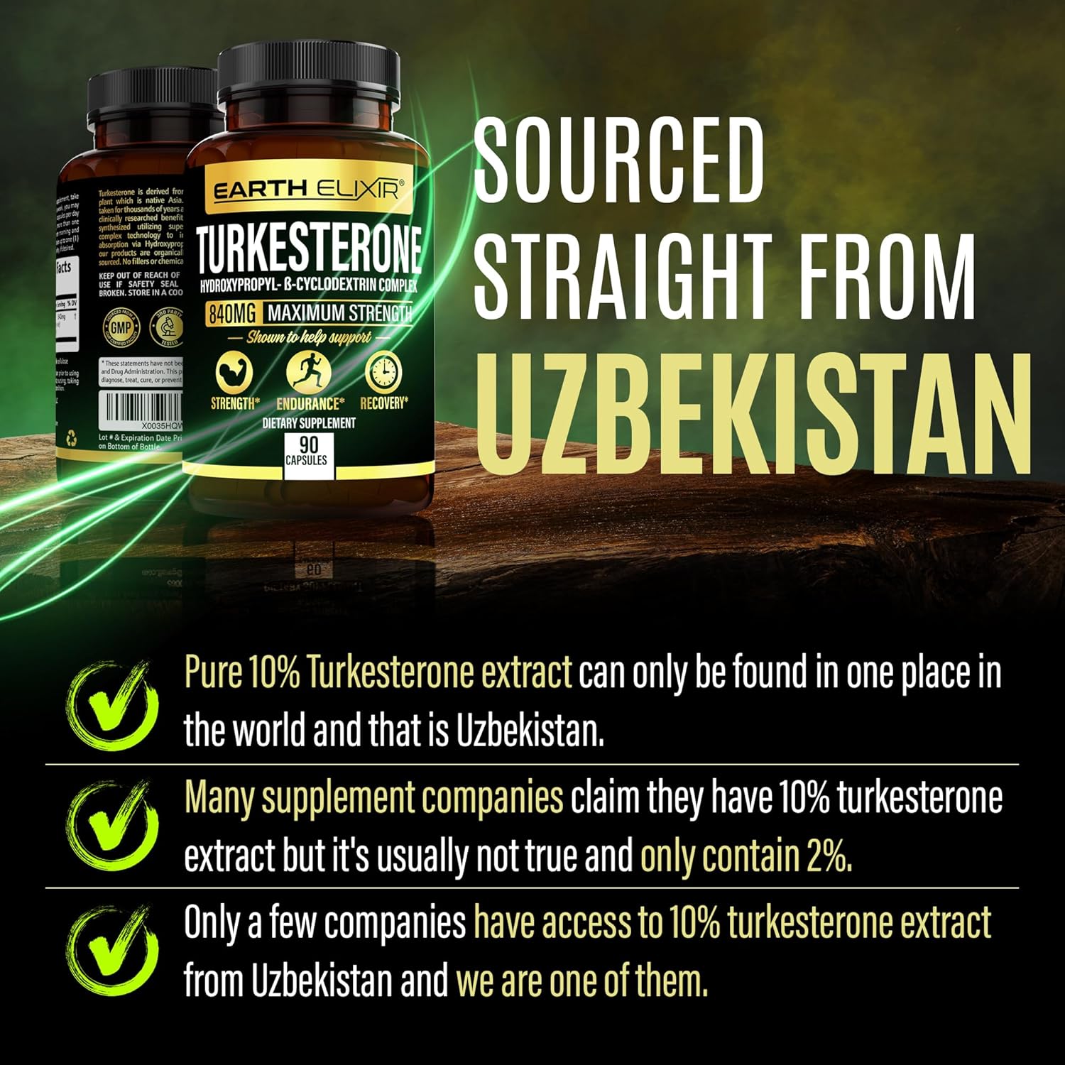 About this item Top-quality Turkesterone supplement: Elevate your performance with Earth Elixir's premium Turkesterone supplement for men and women. Sourced exclusively from Uzbekistan, the only place in the world where you can find pure 10% Turkesterone extract, our product sets a new standard. Unlike other supplement companies that claim 10% extract but deliver only 2%, we are proud to be among the few suppliers with access to authentic Uzbekistan Turkesterone. Most bioavailable form of Turkesterone: Our Turkesterone supplement utilizes a Turkesterone Hydroxypropyl-Γ-Cyclodextrin complex, enhancing absorption and supporting protein synthesis. Unlock the full potential of this powerful compound. Break through weightlifting plateaus: Looking to push past your limits Our Turkesterone supplement is designed to support strength and post-workout recovery. Turkesterone (Ajuga Turkestanica Extract) has been widely studied for its potential benefits in strength and endurance. Stay consistent, break through plateaus, and take your workouts to the next level. Completely natural: For a natty-friendly experience, pair our Turkesterone with beta ecdysterone, cistanche tubulosa, fadogia agrestis, and tongkat ali. Harness the power of nature to fuel your fitness journey. Most trusted brand on the market: Earth Elixir is committed to transparency, quality, and integrity. We proudly share our testing and sourcing processes, ensuring you get premium, lab-tested ingredients. Take control of your fitness journey with confidence. See more product details, Top-quality Turkesterone supplement: Elevate your performance with Earth Elixir's premium Turkesterone supplement for men and women. Sourced exclusively from Uzbekistan, the only place in the world where you can find pure 10% Turkesterone extract, our product sets a new standard. Unlike other supplement companies that claim 10% extract but deliver only 2%, we are proud to be among the few suppliers with access to authentic Uzbekistan Turkesterone, Most bioavailable form of Turkesterone: Our Turkesterone supplement utilizes a Turkesterone Hydroxypropyl-Γ-Cyclodextrin complex, enhancing absorption and supporting protein synthesis. Unlock the full potential of this powerful compound, Break through weightlifting plateaus: Looking to push past your limits Our Turkesterone supplement is designed to support strength and post-workout recovery. Turkesterone (Ajuga Turkestanica Extract) has been widely studied for its potential benefits in strength and endurance. Stay consistent, break through plateaus, and take your workouts to the next level, Completely natural: For a natty-friendly experience, pair our Turkesterone with beta ecdysterone, cistanche tubulosa, fadogia agrestis, and tongkat ali. Harness the power of nature to fuel your fitness journey, Most trusted brand on the market: Earth Elixir is committed to transparency, quality, and integrity. We proudly share our testing and sourcing processes, ensuring you get premium, lab-tested ingredients. Take control of your fitness journey with confidence