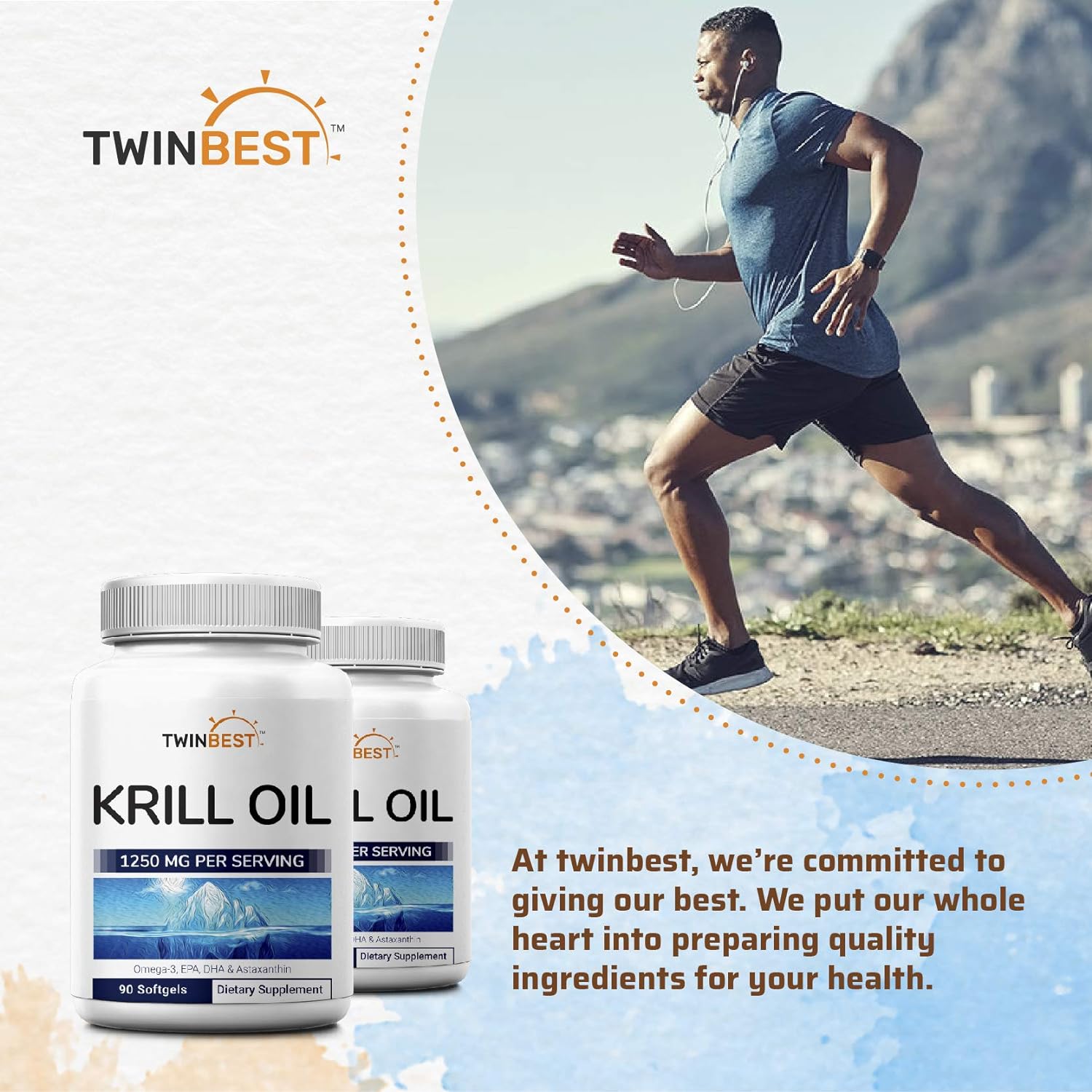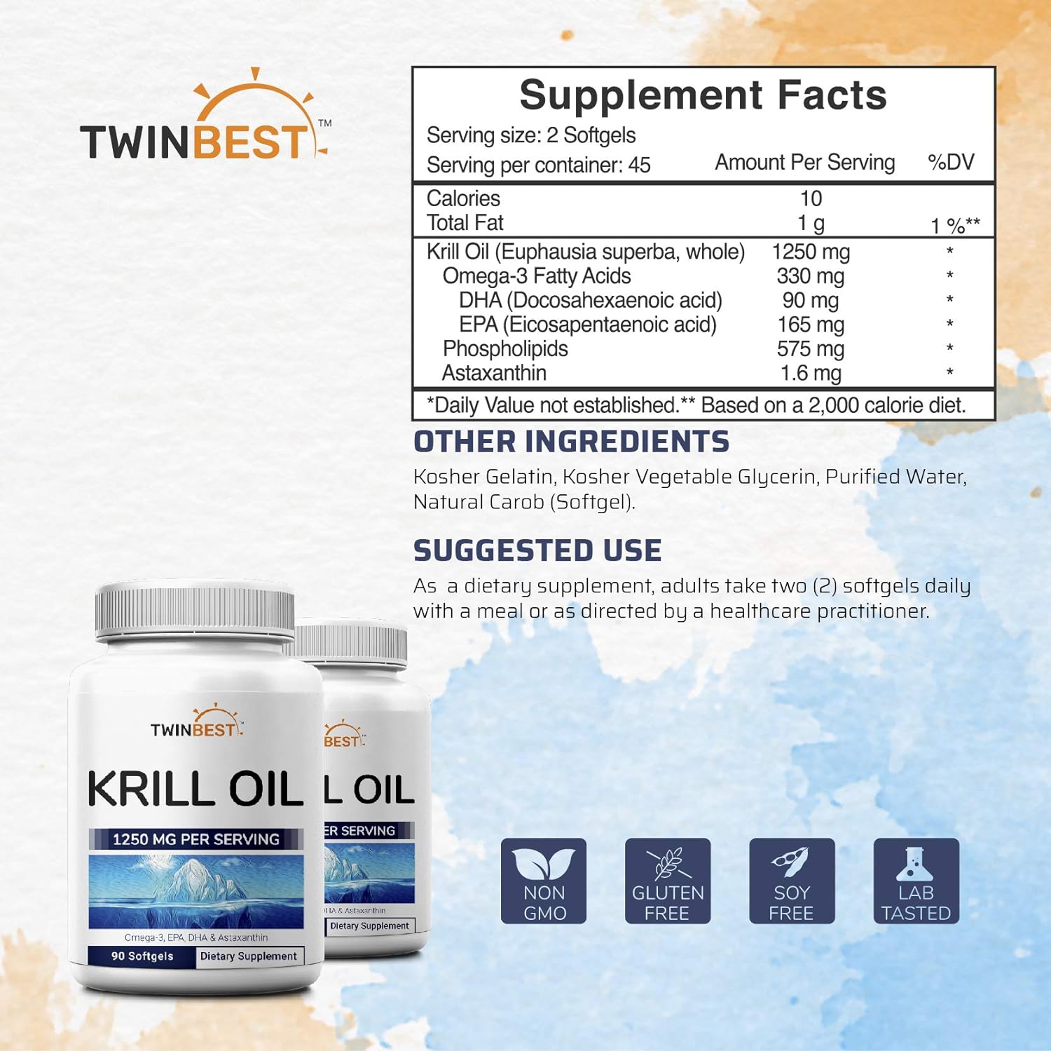 DESCRIPTION : Twinbest Antarctic Krill Oil Softgels, 2-Pack, 1000mg Per Serving, 180 Softgel Supply, Rich in Omega 3 Fatty Acids, EPA, DHA, Phospholipids and Astaxanthin, Non-GMO