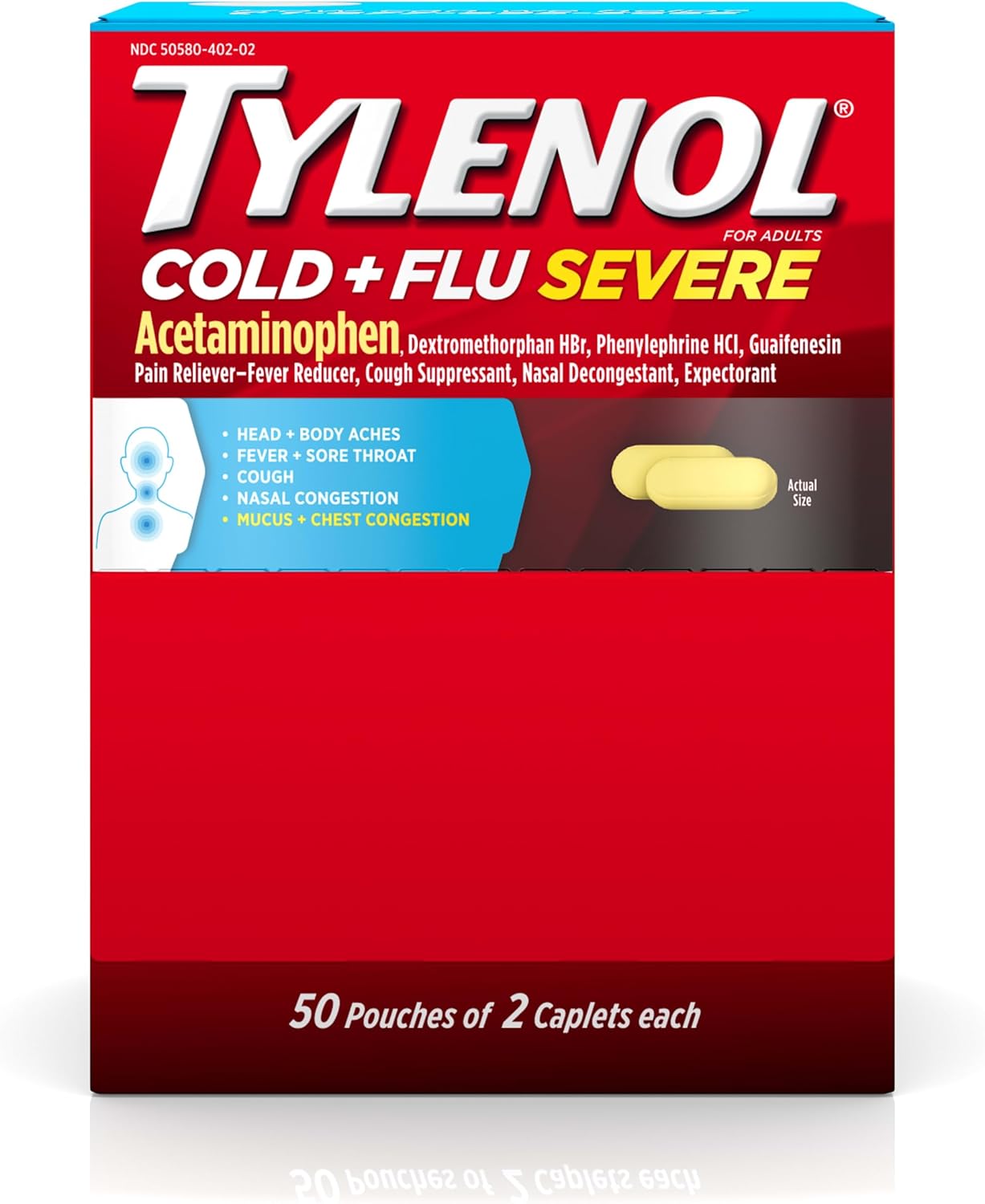 Tylenol Cold + Flu Severe Medicine Caplets For Cold & Flu Symptom Relief, Fever Reducer, Pain Reliever, Cough Suppressant, Nasal Decongestant & Expectorant, 50 Pouches Of 2 Ct
