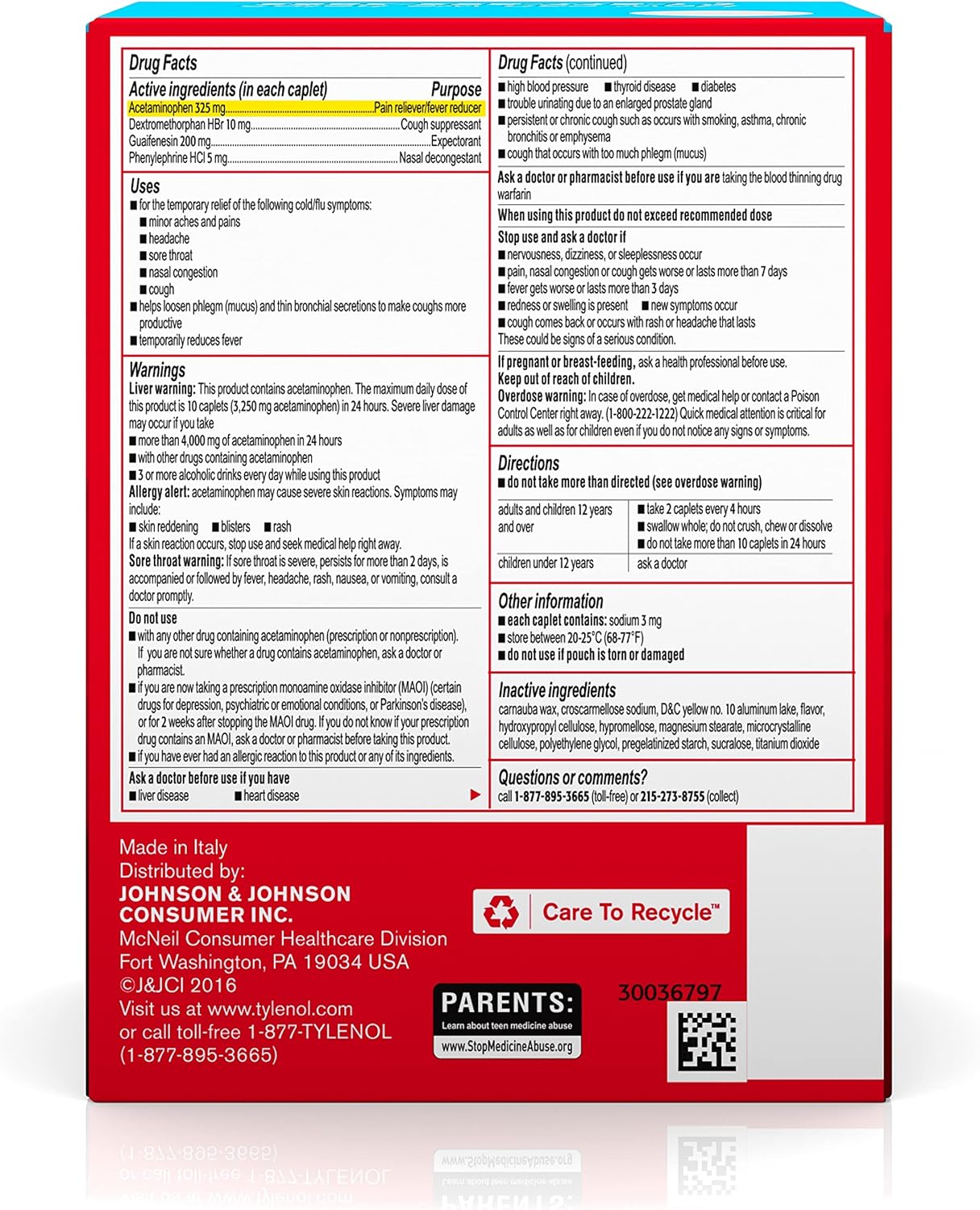 About this item 2-count of Tylenol Cold + Flu Severe Caplets provide effective relief of multiple symptoms due to the flu and common cold This severe cold & flu medicine helps relieve headache, minor aches and pains, sore throat, nasal congestion, and cough. It also helps loosen phlegm (mucus) and thin bronchial secretions to make coughs more productive. Each caplet contains 325 mg of acetaminophen to help reduce fever and relieve minor aches & pains, as well as 10 mg of the cough suppressant dextromethorphan HBr to help quiet coughs Each caplet also contains 5 mg of the nasal decongestant phenylephrine HCl to help relieve congestion and 200 mg of the expectorant guaifenesin to help loosen phlegm (mucus) and make coughs more productive From the #1 doctor-recommended pain relief brand, this cold & flu medicine is suitable for use by adults and children 12 years and older for powerful multi-symptom relief › See more product details,2-count of Tylenol Cold + Flu Severe Caplets provide effective relief of multiple symptoms due to the flu and common cold,This severe cold & flu medicine helps relieve headache, minor aches and pains, sore throat, nasal congestion, and cough. It also helps loosen phlegm (mucus) and thin bronchial secretions to make coughs more productive,Each caplet contains 325 mg of acetaminophen to help reduce fever and relieve minor aches & pains, as well as 10 mg of the cough suppressant dextromethorphan HBr to help quiet coughs,Each caplet also contains 5 mg of the nasal decongestant phenylephrine HCl to help relieve congestion and 200 mg of the expectorant guaifenesin to help loosen phlegm (mucus) and make coughs more productive,From the #1 doctor-recommended pain relief brand, this cold & flu medicine is suitable for use by adults and children 12 years and older for powerful multi-symptom relief