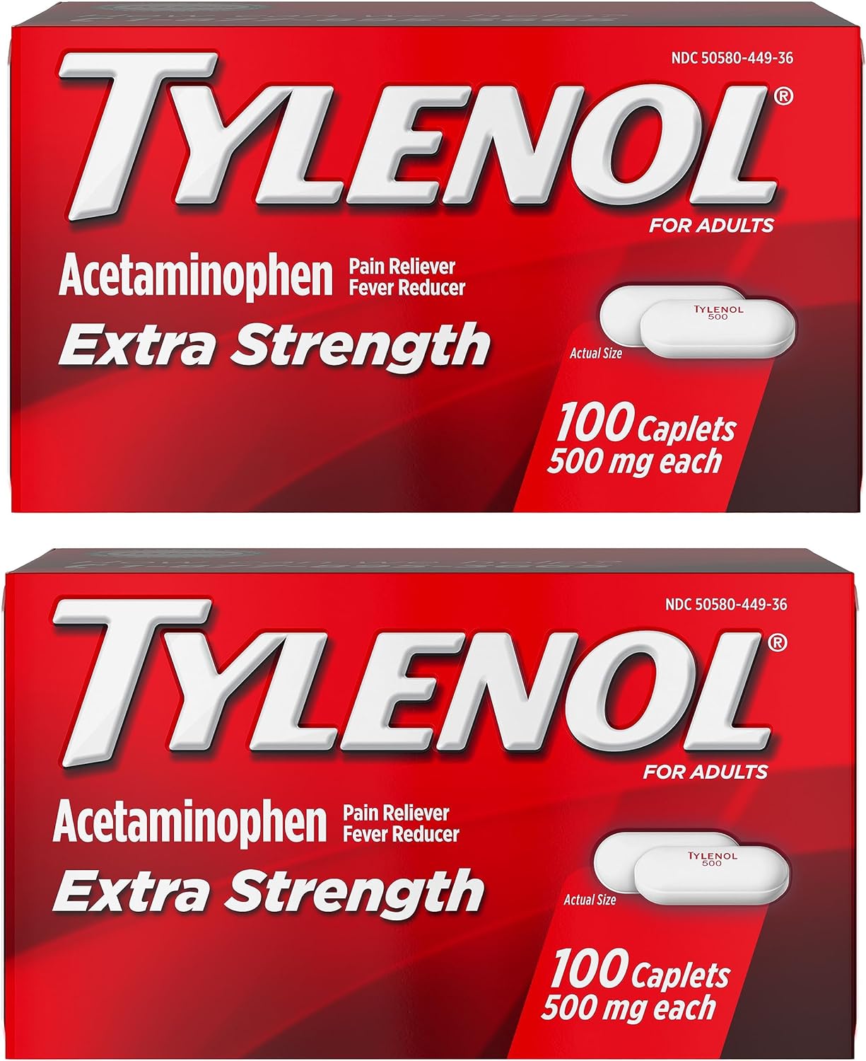 PAIN RELIEF & FEVER REDUCER: Tylenol Extra Strength Caplets temporarily reduce fever and provides pain relief from minor aches and pains; Offers headache relief, backache pain relief, menstrual cramps pain relief, and pain caused by the common coldACETAMINOPHEN FORMULA: Each Tylenol Extra Strength pain relief pill contains 500 mg of acetaminophen in each caplet for effective pain relief of minor aches/pains; Effective fever reducerFAST ACTING TYLENOL EXTRA STRENGTH: Includes 200 caplets; Use 500mg acetaminophen caplets to help provide pain relief of symptoms caused by the common cold, toothache, headache, backache, and menstrual crampsHOW TO USE: Adults & children ages 12+, take two pain relief caplets every six Hours while symptoms last; Do not exceed 6 caplets in 24 hours unless directed by a doctor; Safe and effective when used as directedINCLUDES: Value pack of 2, 100 Tylenol Extra Strength pain relief caplets; #1 doctor recommended brand for pain relief and fever reduction; When used as directed Tylenol Extra Strength Pain Reliever offers an excellent safety profileTylenol Extra Strength caplets with 500mg of acetaminophen reduce fever and provide temporary relief of minor aches and pains. From the #1 doctor-recommended brand of pain reliever, each caplet contains 500 mg of acetaminophen for effective, extra strength pain relief. Both a fever reducer and pain reliever, it relieves minor aches and pains due to headache, backache, toothache, minor pain of arthritis, the common cold, and premenstrual and menstrual cramps. When used as directed, this extra strength oral pain reliever has an excellent safety profile and can be used by adults and children 12 years and older. To use, adults and children 12 years and over, take two caplets every 6 hours while symptoms last and do not take more than six caplets in 24 hours. From Tylenol, the #1 doctor recommended brand for pain relief and fever reduction