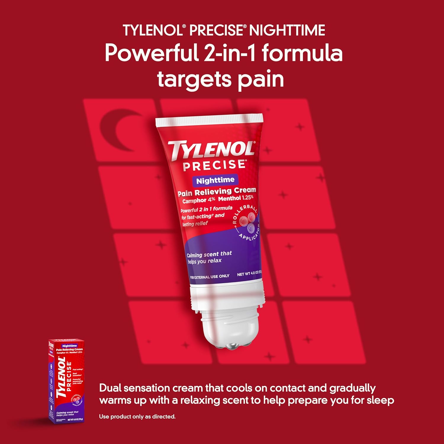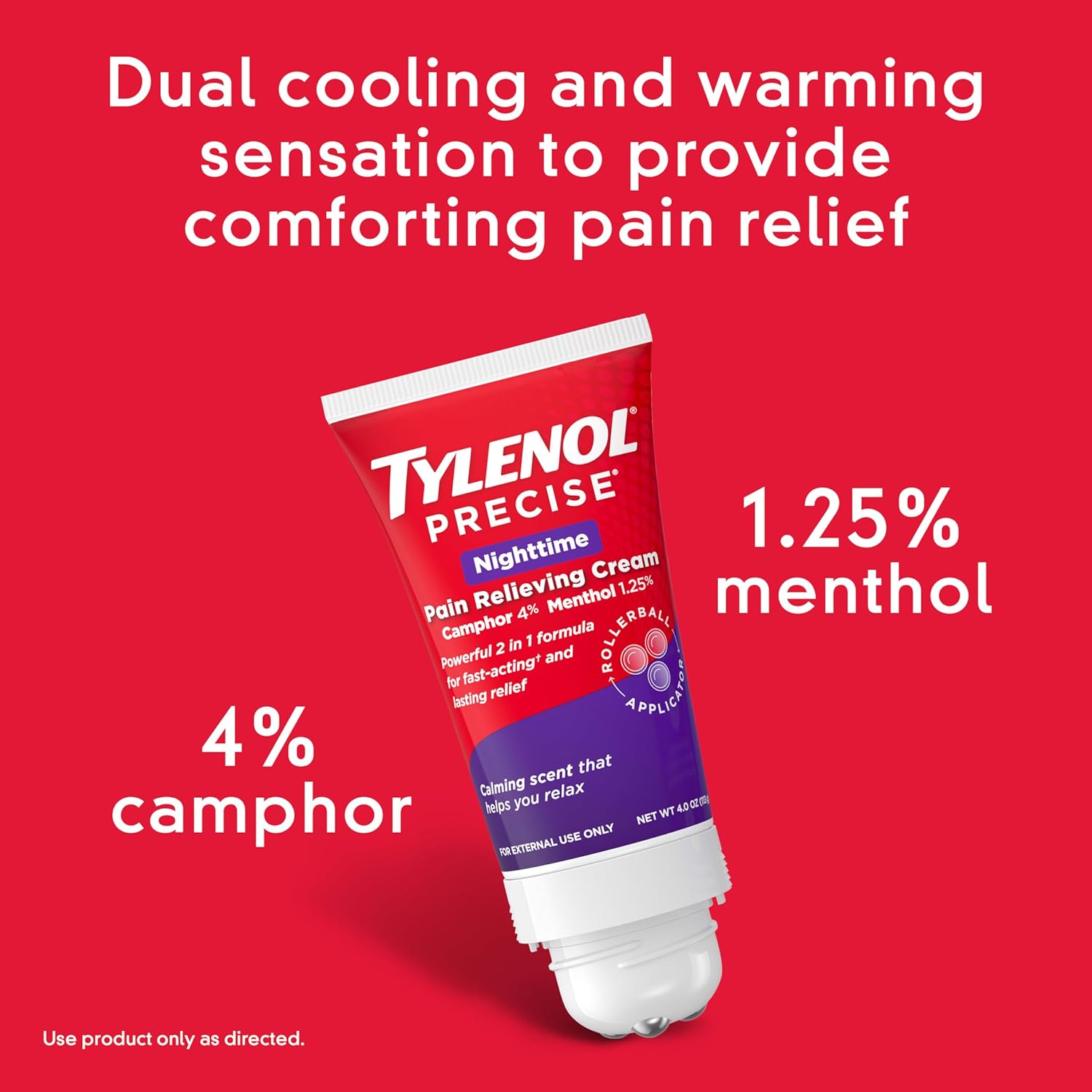 4-ounce tube of Tylenol Precise Nighttime Pain Relieving Cream with a combination of Camphor & Menthol + calming scent for targeted, penetrating nighttime pain relief for muscles & joints including back, shoulders, legs, hips, knees, ankles & more