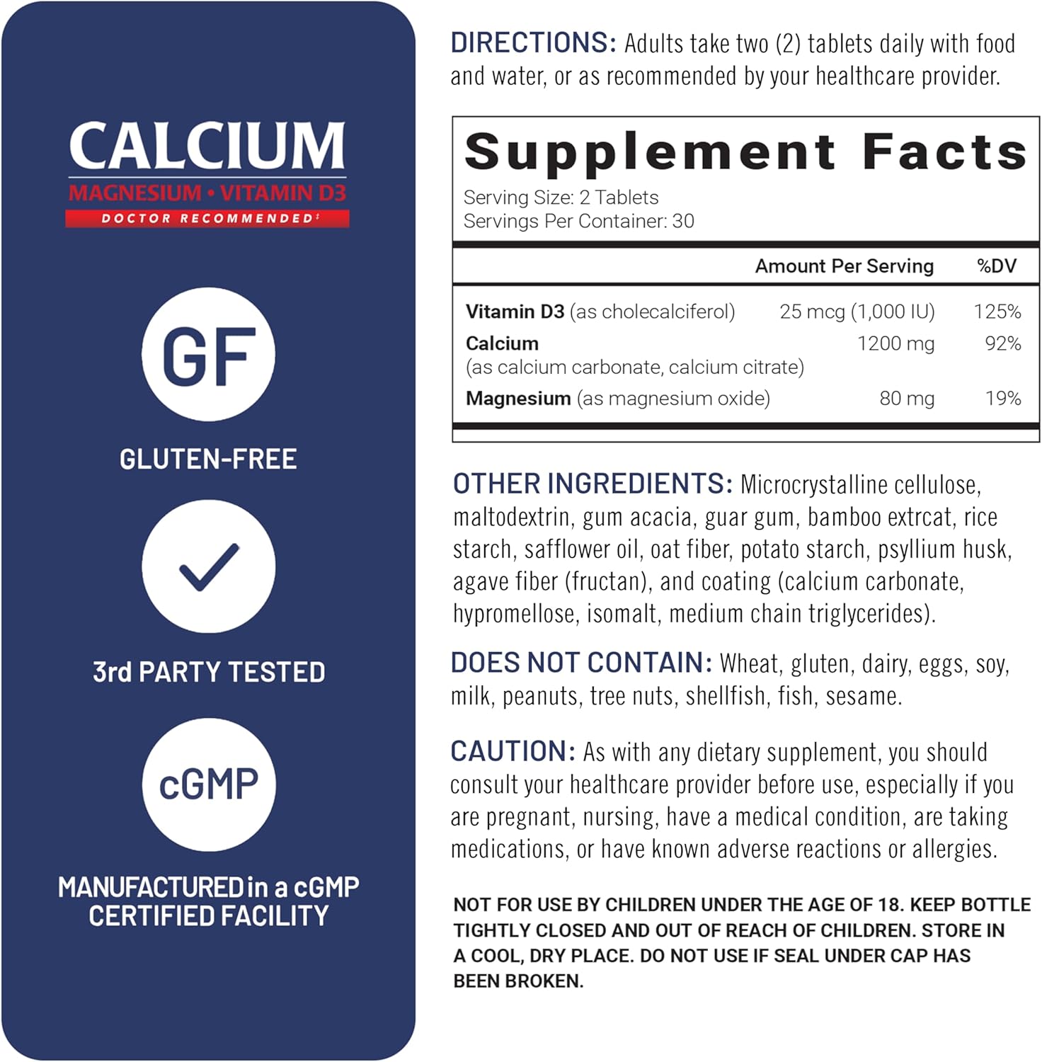 PREMIUM INGREDIENTS: U.S. Doctors’ Clinical Calcium, Magnesium + Vitamin D3 tablets contain high-quality ingredients and are manufactured in the USA in a cGMP-certified facility with third-party quality control audits