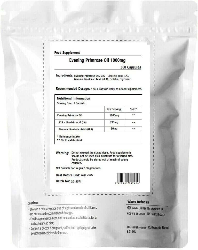 Ukhealthhouse Evening Primrose Oil – Epo Capsules, 1000Mg X 360 Softgels – High Strength Omega 6 Gla Content – Great For Skin, Immune System, Hormonal Pain, Hot Flushes & Women’S Health