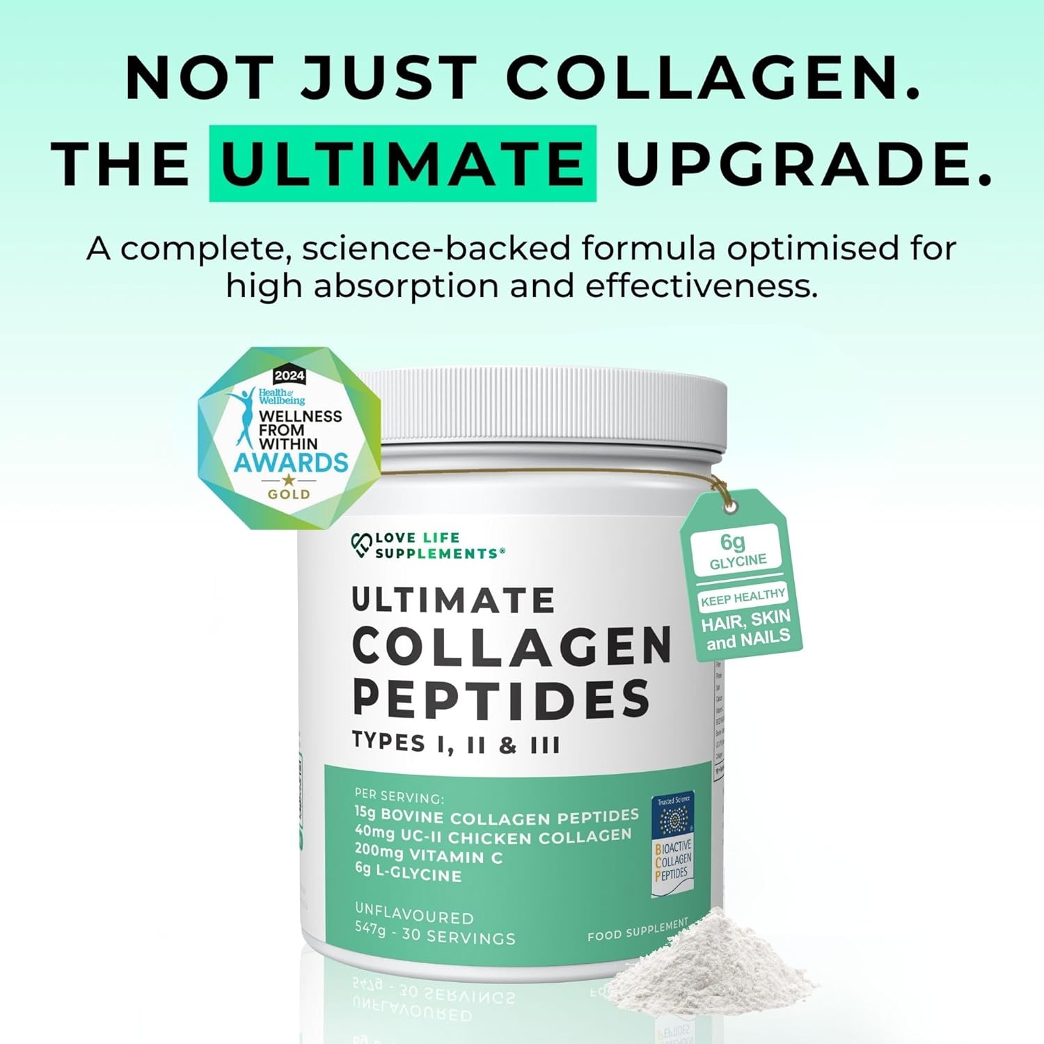 Ultimate Collagen Peptides By Lls - Hydrolysed Bovine Collagen Powder Types 1, 2 & 3 + Vitamin C & Glycine - Joint, Ligament, Tendon Strength & Muscle Building - Unflavoured, 547G, 30 X 18G Servings