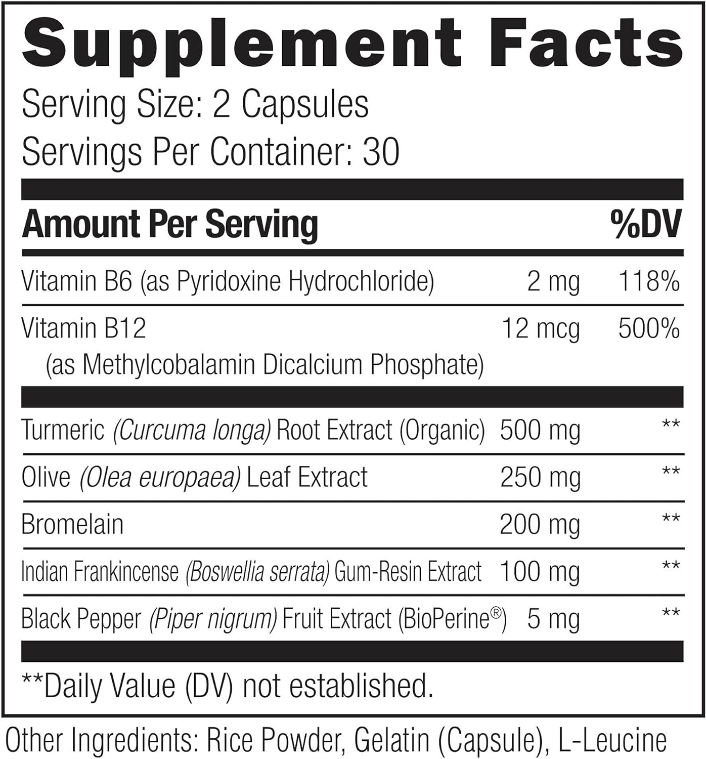 BULLET POINTS  :   1 >  Natural Comfort - Supporting Ingredients - turmeric, frankincense, bromelain, olive leaf extract, vitamin B6, and vitamin B12 work with the body to support comfort and relief