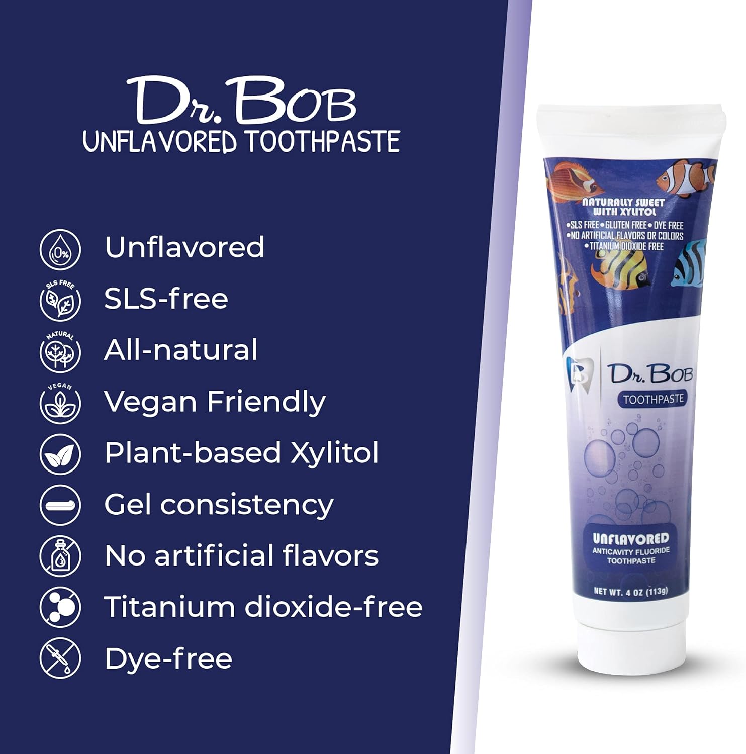 KIDS WITH SENSITIVITIES: Our flavor-free toothpaste is great for kids and adults with taste sensitivities. Our unflavored formula will not leave a bad taste in their mouthsPREMIUM ORAL HEALTH: Our unflavored toothpaste is made for adults and children of all ages. Fluoride toothpaste offers tartar control, enamel repair, cavity prevention, reduced plaque, and oral healthNATURAL TOOTHPASTE: Made from all-natural, plant-based Xylitol with no harsh chemicals, and no artificial flavors or colors, Dr. Bob's is SLS-free, gluten-free, titanium dioxide-free, and dye-freeRECYCLABLE, MADE IN USA: With a focus on the environment, our flavorless toothpaste tube is made with Green Polyethylene, making it recyclable. Our unflavored toothpaste is manufactured in the USADR BOB : Problems with your toothpaste We offer a no-questions-asked and will offer a full refund. Contact us through ’s messaging system so we can assist you with any issuesUnflavored Toothpaste Natural Xylitol Baby Toddler Kids Toothpaste with Fluoride for Sensitive Teeth No Artificial Flavors SLS Free Dye Free 4oz 4 Ounce Pack of 1