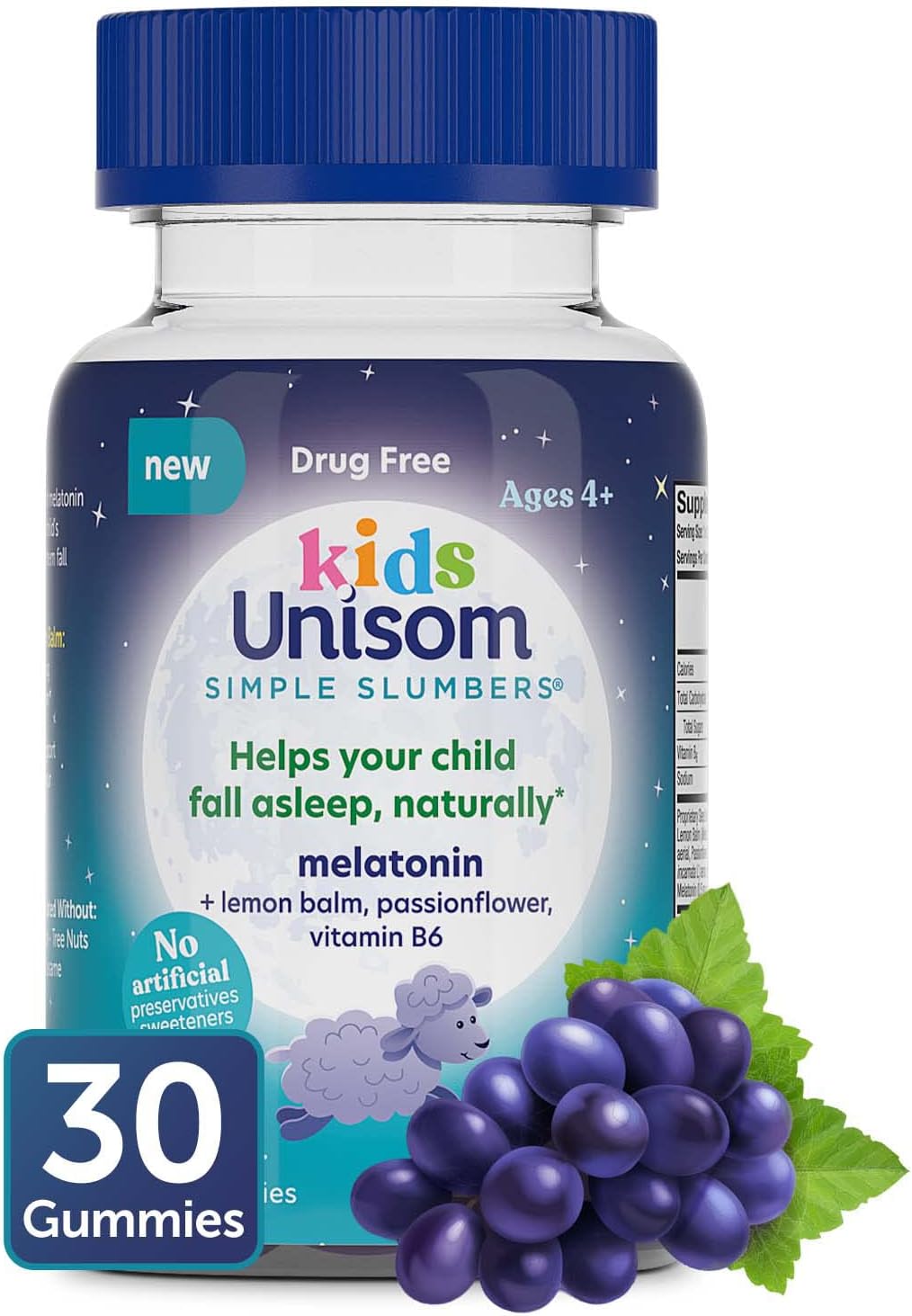 Help Your Child Achieve The Sweet Dreams They Deserve With Unisom Simple Slumbers Kids Melatonin Gummies. This Drug-Free Sleep Supplement Contains A Gentle Dose Of Melatonin That Helps Your Child Fall Asleep Naturally.* Unisom Grape-Flavored Sleep Gummies For Kids Feature A Proprietary Blend Of Passion Flower And Lemon Balm, Believed To Help Calm The Mind,* As Well As Vitamin B6, An Antioxidant That May Help Support Normal Melatonin Production In Your Child’S Body.* *These Statements Have Not Been Evaluated By The Food And Drug Administration. This Product Is Not Intended To Diagnose, Treat, Or Prevent Any Disease