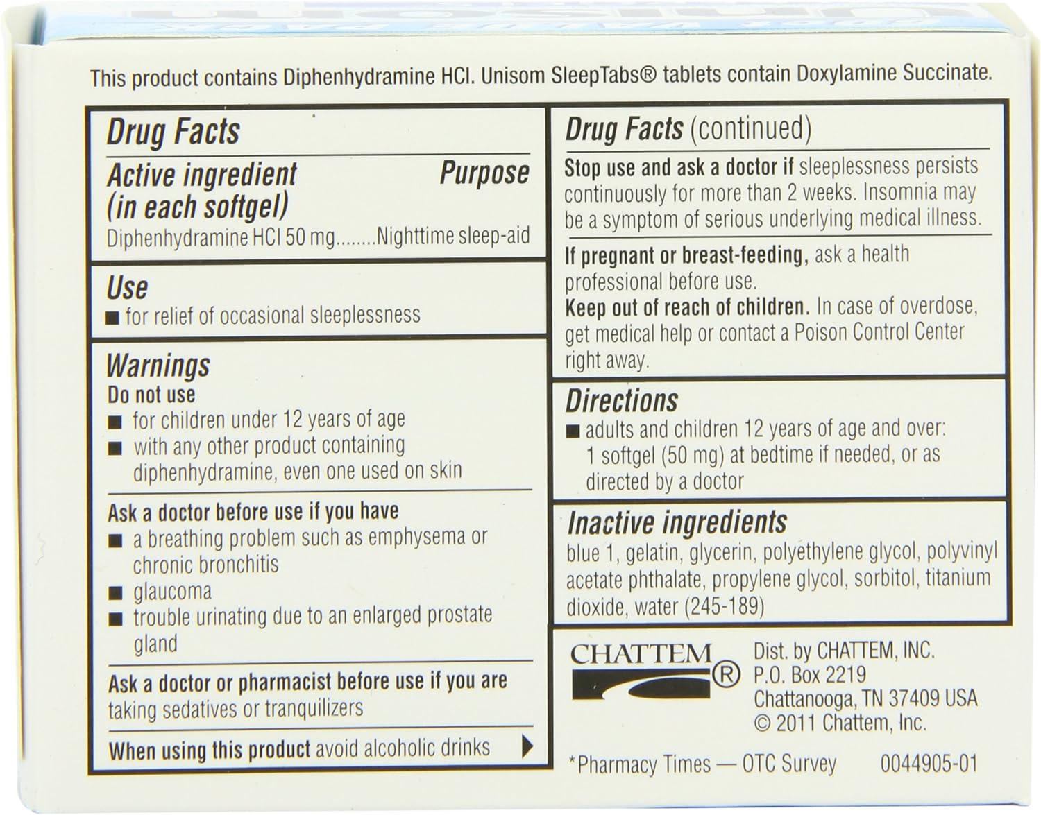 Includes: One (1) 60-Count Bottle Of Unisom Sleepgels Nighttime Sleep-Aid; One Softgel Per Dose