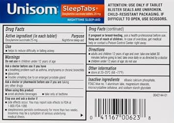 When A Stressful Day Gets In The Way Of A Restful Night, You Need Something That Can Help You Fall Asleep And Wake Up Refreshed. Unisom Sleeptabs Are Over-The-Counter Sleep-Aids That Help You Fall Asleep 33% Faster And Awaken Significantly Fewer Times During The Night.* Sleeptabs With Doxylamine Succinate Are Non-Habit Forming And Safe If Used As Directed. With Sleeptabs, You Can Sleep Through The Night And Wake Up Feeling Recharged Without Grogginess Or Lingering Side Effects. Take Control Of Your Sleep With Unisom, The #1 Pharmacist Recommended Otc Sleep-Aid Brand.** *Versus Placebo In A Clinical Study **Data Represents Brand/Product Selections From The 2019 Pharmacy Times Survey Of Pharmacists' Otc Recommendations