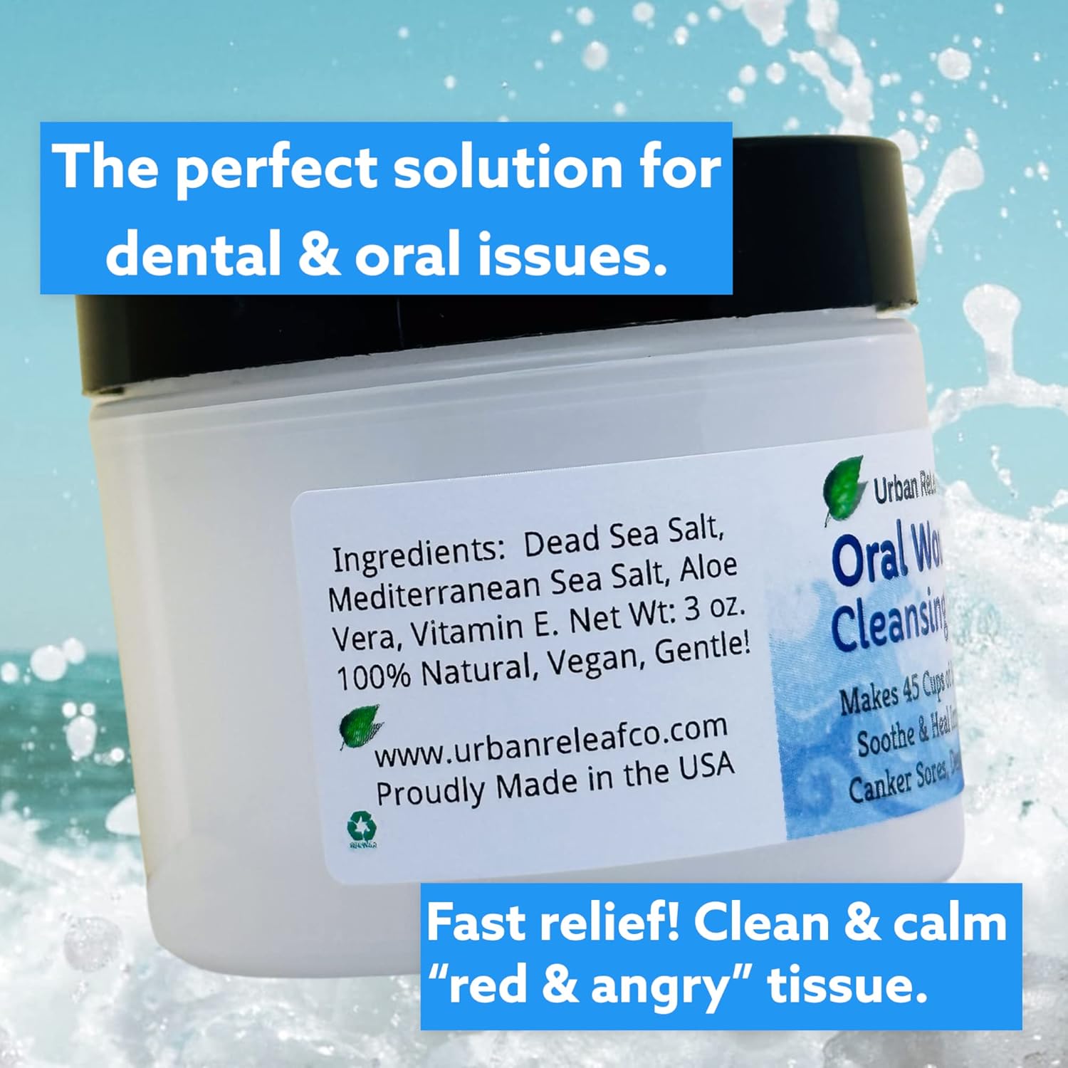About this item Urban ReLeaf Oral Wound Cleansing Salt Intended Use: Soothe Oral Issues from Dental Work, Sores and Irritation Warning: The safety of this product has not been determined. Net wt: 3 ounces Directions: Use after eating and before bedtime. Mix 1/4 teaspoon in 1 cup warm water. Swish in mouth. Hold solution over irritated tissue 1-2 minutes. Rinsing is optional. Warnings: For external use only. Manufactured by: Urban ReLeaf LLC, St. Petersburg, FL 33710. Made in the USA. Product Ingredients: Dead Sea Salt, Mediterranean Sea Salt, Aloe Vera, Vitamin E. See more product details,Urban ReLeaf Oral Wound Cleansing Salt Intended Use: Soothe Oral Issues from Dental Work, Sores and Irritation Warning: The safety of this product has not been determined. Net wt: 3 ounces Directions: Use after eating and before bedtime. Mix 1/4 teaspoon in 1 cup warm water. Swish in mouth. Hold solution over irritated tissue 1-2 minutes. Rinsing is optional. Warnings: For external use only. Manufactured by: Urban ReLeaf LLC, St. Petersburg, FL 33710. Made in the USA. Product Ingredients: Dead Sea Salt, Mediterranean Sea Salt, Aloe Vera, Vitamin E