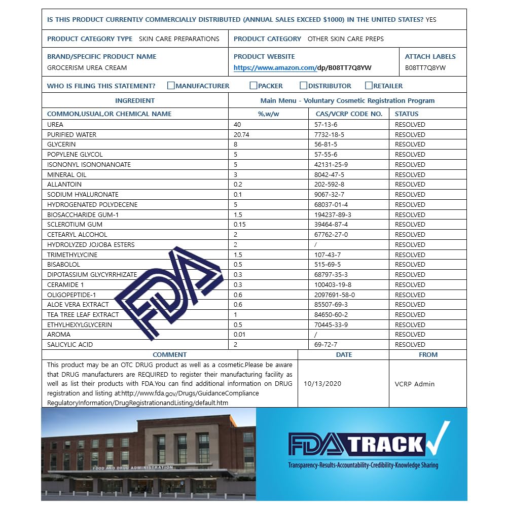 Organic IngredientsWater, Urea, Glycerin, Propylene Glycol, Isononyl Isononanoate, Mineral oil, Allantoin, Hyaluronic Acid, Hydrogenated Polydecene, Salicylic acid,Biosaccharide Gum-1, Sclerotium Gum, Cetearyl Alcohol, Trimethylglycine, Bisabolol, Dipotassium Glycyrrhizate, Ceramide 1, Oligopeptide-1, Aloe Vera extract, Tea Tree Leaf Extract, Ethylhexylglycerin, Aroma, Hydrolyzed Jojoba Esters