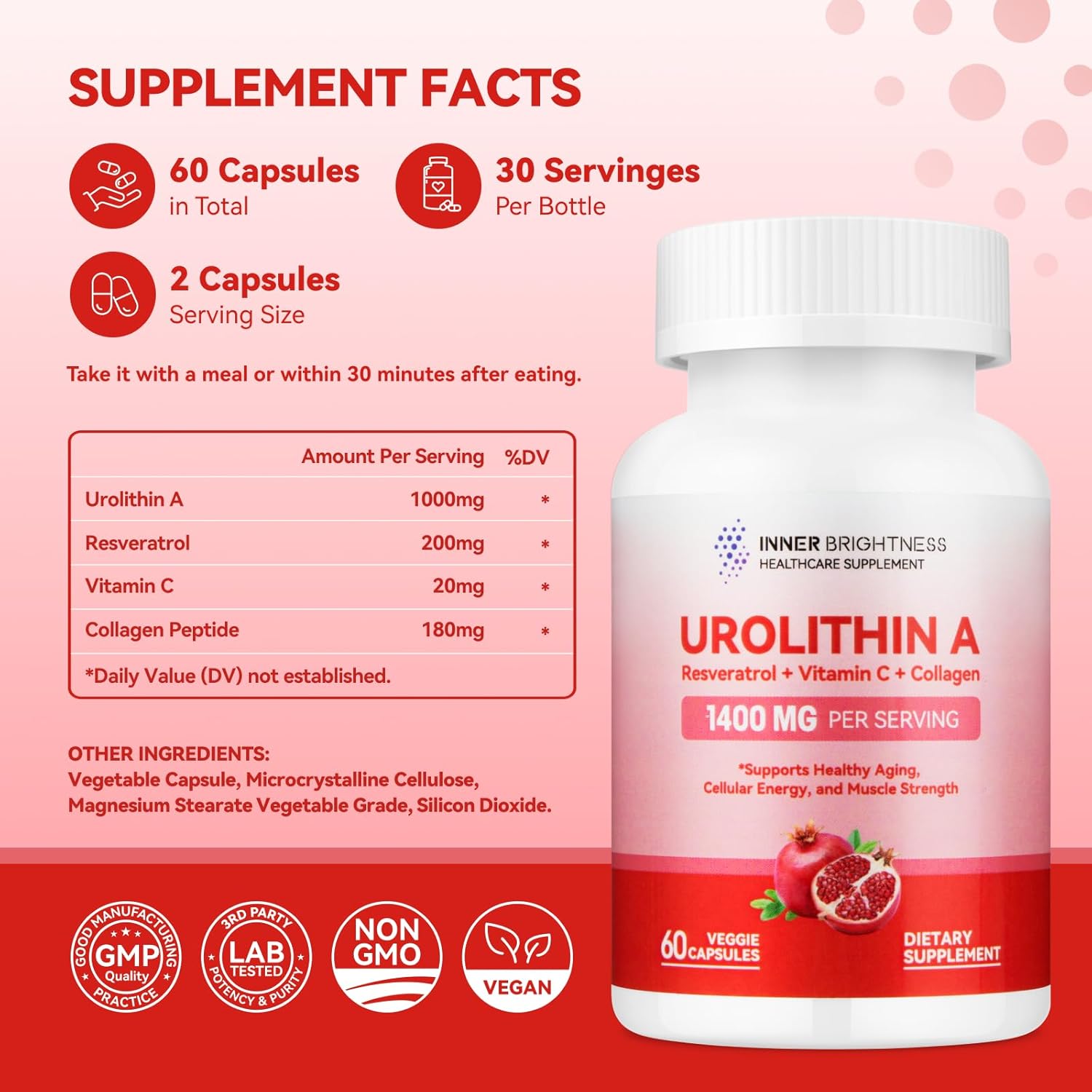 Urolithin A Supplement 1400 Mg - Non-Gmo, Gluten-Free, Anti-Aging, Cellular Renewal, Muscle Strength, Endurance & Longevity Support, Liposomal Urolithin A, 60 Count