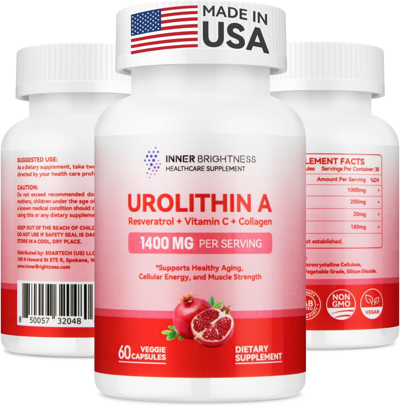 About this item Liposomal Technology for Superior Absorption: Boost your energy with our Urolithin A supplement, powered by advanced liposomal technology for superior absorption. This premium Urolithin A supports mitochondrial health, enhances energy, and improves performance. Combined with collagen, it helps you feel energized, rejuvenated, and radiant. Support Cellular & Skin Health: Nurture your cells and skin from within with 1000mg of Urolithin A and 180mg collagen! This Urolithin A supplement ensures maximum absorption, promoting cellular renewal and enhancing skin elasticity and radiance. Enhance Muscle Recovery: Combat post-workout soreness with our advanced Urolithin A supplement. It aids muscle recovery making it an essential fitness companion. Healthy Aging & Beauty: Fight aging with our premium Urolithin A supplement! It enhances absorption, boosting cellular health and vitality. Collagen supports skin elasticity, reduces wrinkles, and helps you stay youthful. Pure & High-Quality: 100% vegan, non-GMO, and free from artificial fillers, gluten, dairy, and soy. Manufactured in a GMP-certified facility in the USA, each bottle of our Urolithin A supplement is third-party tested for purity and potency. See more product details,Liposomal Technology for Superior Absorption: Boost your energy with our Urolithin A supplement, powered by advanced liposomal technology for superior absorption. This premium Urolithin A supports mitochondrial health, enhances energy, and improves performance. Combined with collagen, it helps you feel energized, rejuvenated, and radiant,Support Cellular & Skin Health: Nurture your cells and skin from within with 1000mg of Urolithin A and 180mg collagen! This Urolithin A supplement ensures maximum absorption, promoting cellular renewal and enhancing skin elasticity and radiance,Enhance Muscle Recovery: Combat post-workout soreness with our advanced Urolithin A supplement. It aids muscle recovery making it an essential fitness companion,Healthy Aging & Beauty: Fight aging with our premium Urolithin A supplement! It enhances absorption, boosting cellular health and vitality. Collagen supports skin elasticity, reduces wrinkles, and helps you stay youthful,Pure & High-Quality: 100% vegan, non-GMO, and free from artificial fillers, gluten, dairy, and soy. Manufactured in a GMP-certified facility in the USA, each bottle of our Urolithin A supplement is third-party tested for purity and potency