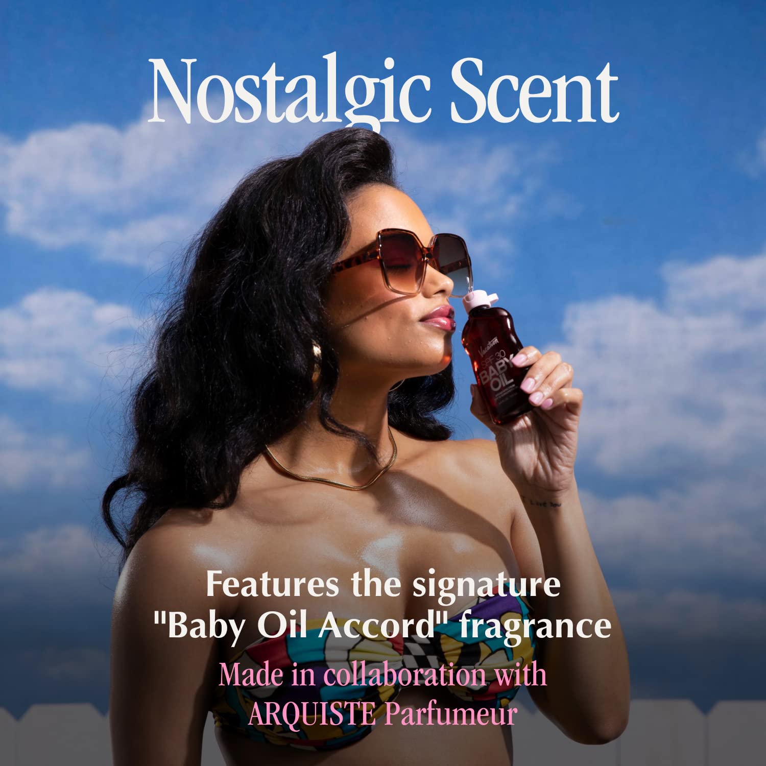 NOSTALGIC SCENT - Features the signature âBaby Oil Accordâ scent. A modern, more sophisticated take on nostalgic baby oil scents developed by the award-winning ARQUISTE Parfumeur. A celebrated scent that will allow you to indulge in true nostalgic luxury with our tanning oil for outdoor sun while giving your skin the best in sun protection