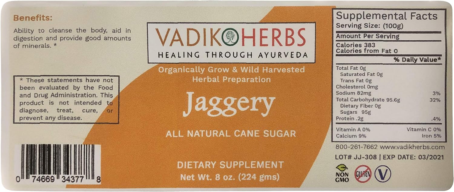 Vadik Herbs Jaggery (Sugar Cane Sugar, Gur) 8Oz. | Premium Quality, Ships From California | Ability To Detox And Cleanse