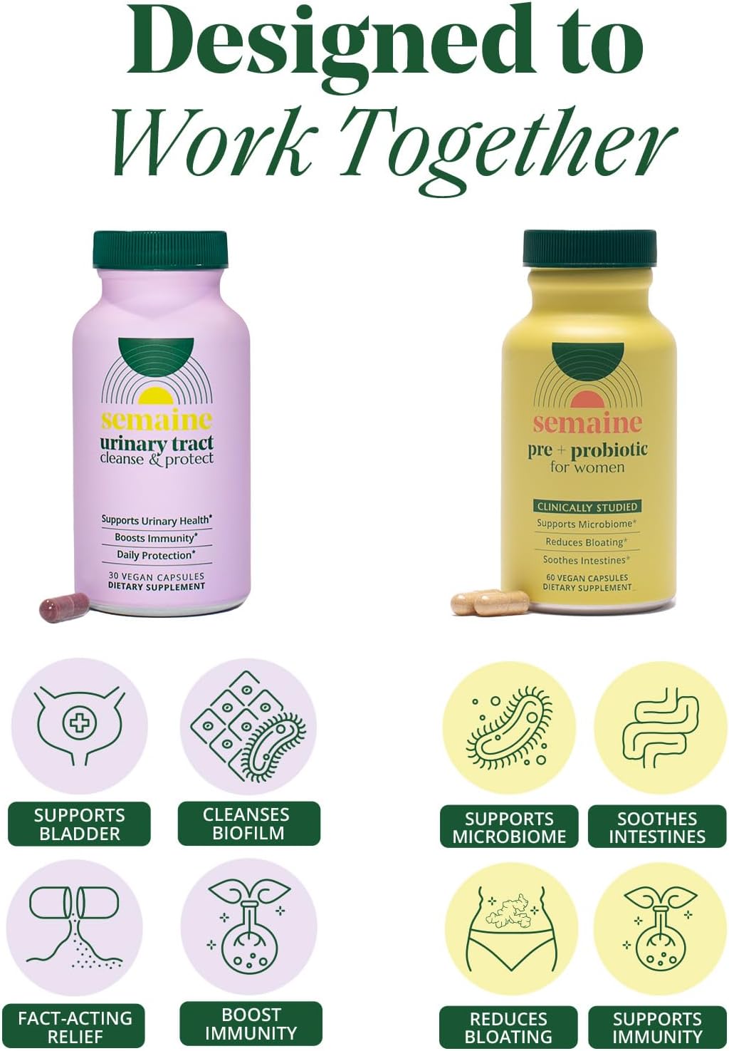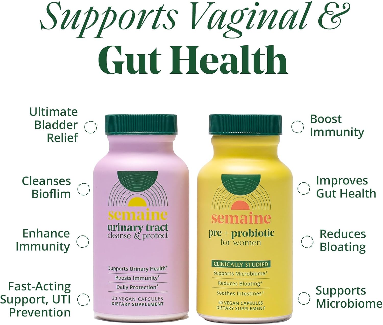BLADDER, GUT, AND VAGINAL HEALTH: Urinary Tract Cleanse & Protect (30 ct.) prevents and soothes pesky UTIs in less than 12 hours. Pre+Probiotic for Women (60 ct.) nourishes and promotes gut health while protecting against BV and yeast infections