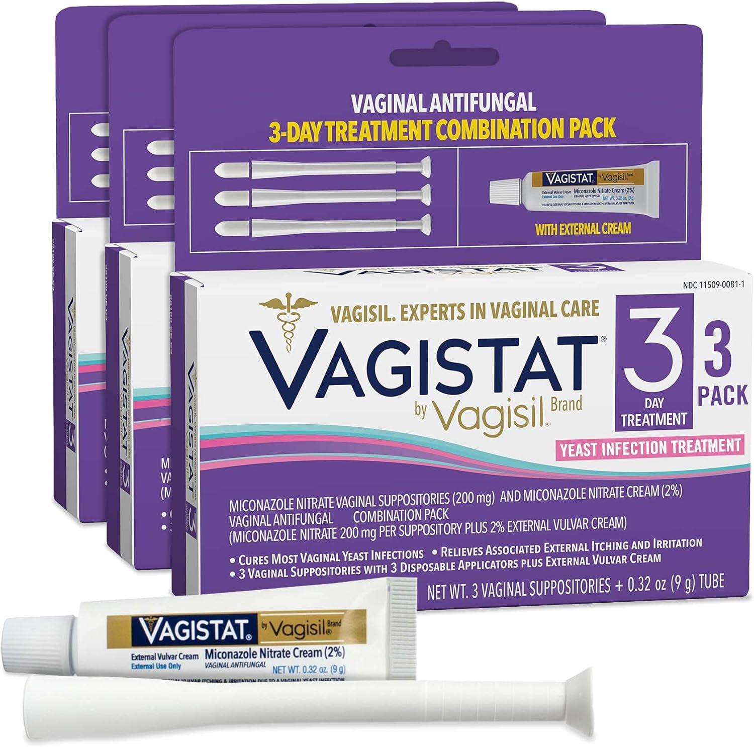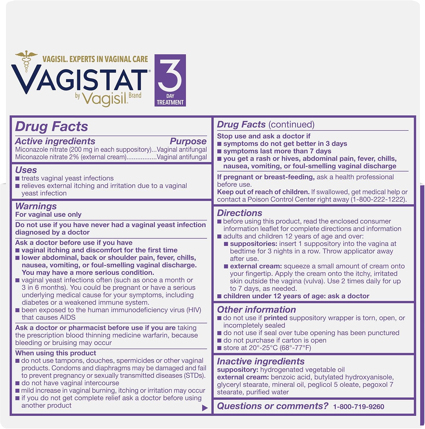 Each Vagistat 3 Day Yeast Infection Treatment Box Includes 3 Miconazole Nitrate (2%) Vaginal Suppositories (200 Milligram) And External Vaginal Antifungal Cream (.32 Ounce)