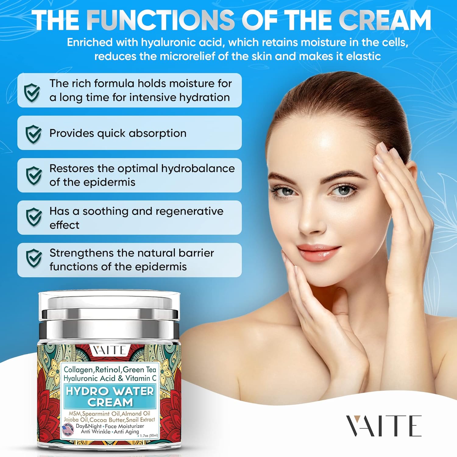 VAITE Water Based Moisturizer Face - Best Cream Facial Care With Hyaluronic Acid For Dry Skin Crema Women And Mens, Simple Skincare Hydrating Booster for Every Day with Collagen, Retinol, Green Tea Hyaluronic Acid & Vitamin C 1.7