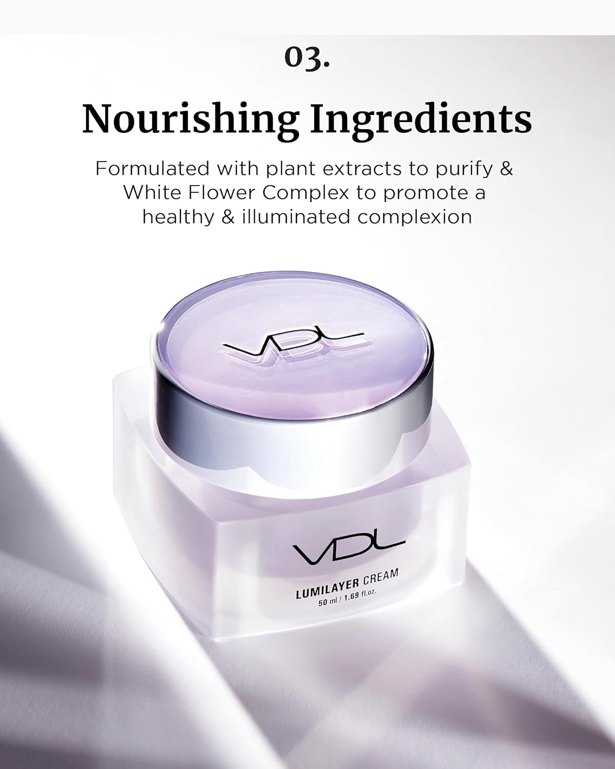 Advanced Formulation - Powered By The Penta Prism Mechanism, Vdl Lumilayer Cream Combines Skincare And Makeup For A Natural And Dimensional Facial Transformation. Experience The Effortless Creation Of A Radiant And Three-Dimensional Appearance, As This Cream Effectively Enhances The Contours Of Your Face