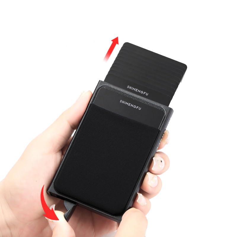 The VALUEVIBES Card Case is a sleek and modern slim wallet designed for convenience, security, and style. Crafted with durable RFID-blocking metal, this minimalist card holder protects your personal information from electronic theft while keeping your essentials neatly organized. With a smooth pop-up mechanism, it allows quick access to up to 12 cards, making it perfect for credit cards, IDs, and business cards. Its compact and lightweight design fits easily in any pocket without adding bulk, making it an ideal everyday wallet for men who value functionality and sophistication. Whether for daily use or travel, this card case combines protection with elegance.