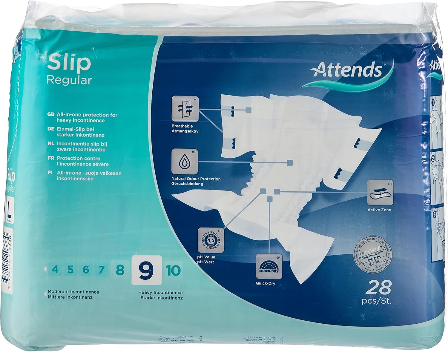 Directions Apply the protector by adjusting the fit with the re-sealable tapes, check the wetness indicator to determine when to change it, and dispose of used protectors hygienically. Consider the user's size and absorbency needs when selecting the product. Maintain skin health by ensuring a comfortable and dry fit. Safety Warning Ensure proper fit for comfort and leakage protection. Dispose of used products in a hygienic and responsible manner. Follow all guidelines to ensure safe and healthy use. P.when('A').execute(function(A) { A.on('a:expander:toggle_description:toggle:collapse', function(data) { window.scroll(0, data.expander.$expander[0].offsetTop-100); }); }); Box Contains 28 x Slip See more,Active Zone: an area centered in the middle of the pad, which provides fast absorption where it is really needed, for exceptional skin dryness and improved leakage protection for the user,Breathable material: enables the skin to breathe, which contributes to improved skin health,Natural Odour Protection: reduces the risk of unpleasant smells,With 35-years of trusted clinical experience, Attends offers a range of comfortable solutions to get you back to the things you love,Core technology with curly fibre acquisition layer: helps to guarantee a low pH which is similar to the skin. This helps to protect the skin and ensures improved skin health