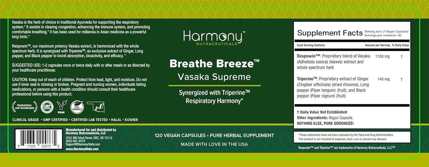 Vasaka has been used for millenniums in Asian medicine for Respiratory health. It has been tested by time, trusted by people and validated by science for bronchodilatation. Helps to support easy, clear and comfort breathing.* Respowin, our proprietary ethically, Wild harvested Vasaka extract is fortified with abundant Triperine, a synergistic blend of black pepper, ginger and piper longum extracts for enhanced absorption, potency and bioavailability.* GMP Compliant Certified Lab Tested Halal Kosher Non-Certified Organic,Supports Respiratory Health