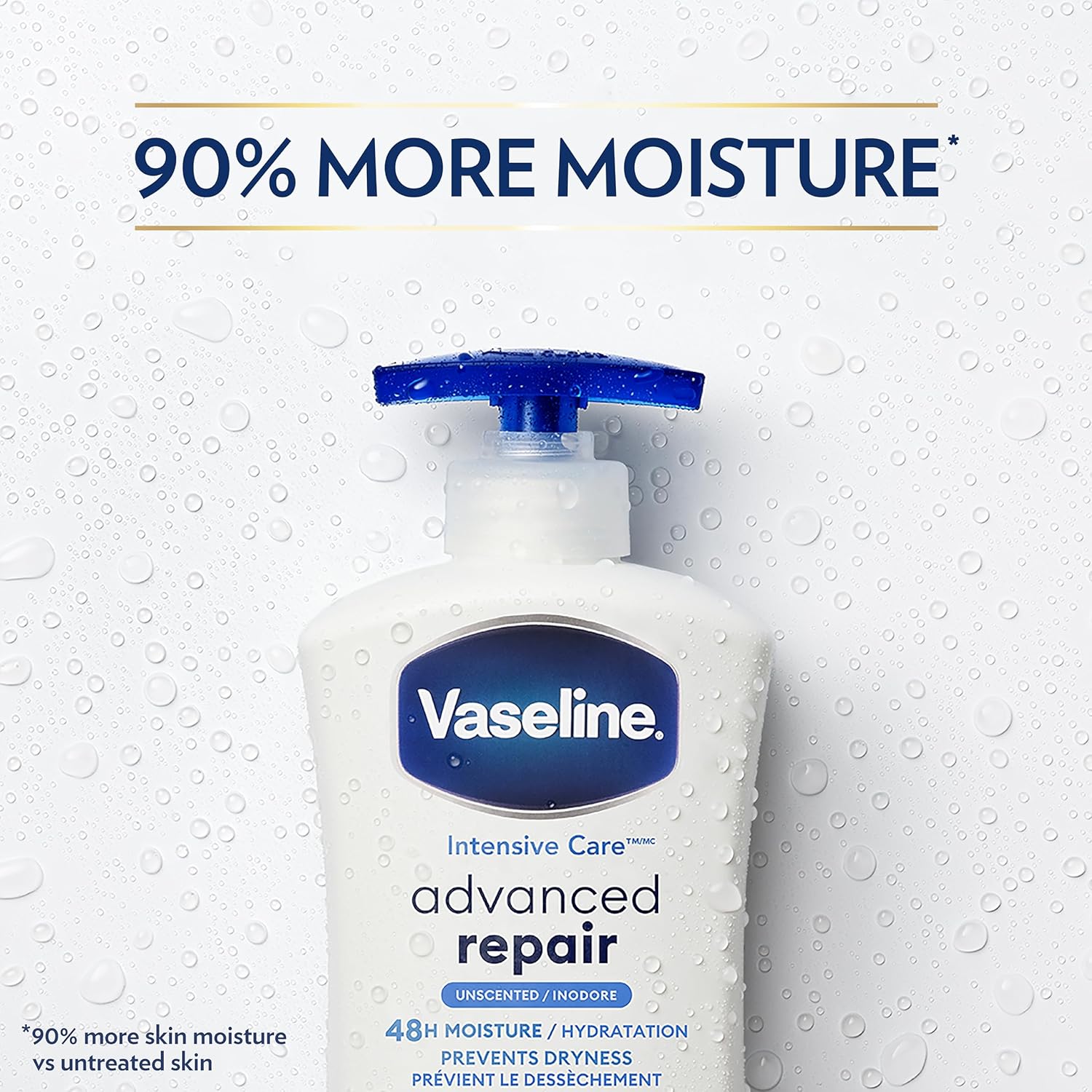 About this item REPAIRS EXTREMELY DRY SKIN: Vaseline Intensive Care Advanced Repair Unscented Body Lotion locks in moisture and repairs extremely dry skin FORMULATED WITH ULTRA-HYDRATING LIPIDS: This unscented body lotion for dry skin is formulated with Vaseline Jelly and Ultra-Hydrating Lipids that fortify the skin barrier and replenish moisture FEEL THE DIFFERENCE: This body moisturizer is clinically tested to provide "90% more moisture (*vs. untreated skin)." NON-GREASY FEEL: This fast-acting unscented lotion absorbs quickly to leave your skin hydrated without feeling greasy DAILY SKIN CARE: Use Vaseline Intensive Care Advanced Repair Body Lotion as your daily lotion for dry, rough skin. Just apply to your skin for long-lasting hydration and noticeably healthier skin EQUITABLE SKIN CARE FOR ALL: Skin health is essential for well-being. We’re helping those underserved get better care for their skin See more product details,REPAIRS EXTREMELY DRY SKIN: Vaseline Intensive Care Advanced Repair Unscented Body Lotion locks in moisture and repairs extremely dry skin,FORMULATED WITH ULTRA-HYDRATING LIPIDS: This unscented body lotion for dry skin is formulated with Vaseline Jelly and Ultra-Hydrating Lipids that fortify the skin barrier and replenish moisture,FEEL THE DIFFERENCE: This body moisturizer is clinically tested to provide "90% more moisture (*vs. untreated skin).",NON-GREASY FEEL: This fast-acting unscented lotion absorbs quickly to leave your skin hydrated without feeling greasy,DAILY SKIN CARE: Use Vaseline Intensive Care Advanced Repair Body Lotion as your daily lotion for dry, rough skin. Just apply to your skin for long-lasting hydration and noticeably healthier skin,EQUITABLE SKIN CARE FOR ALL: Skin health is essential for well-being. We’re helping those underserved get better care for their skin