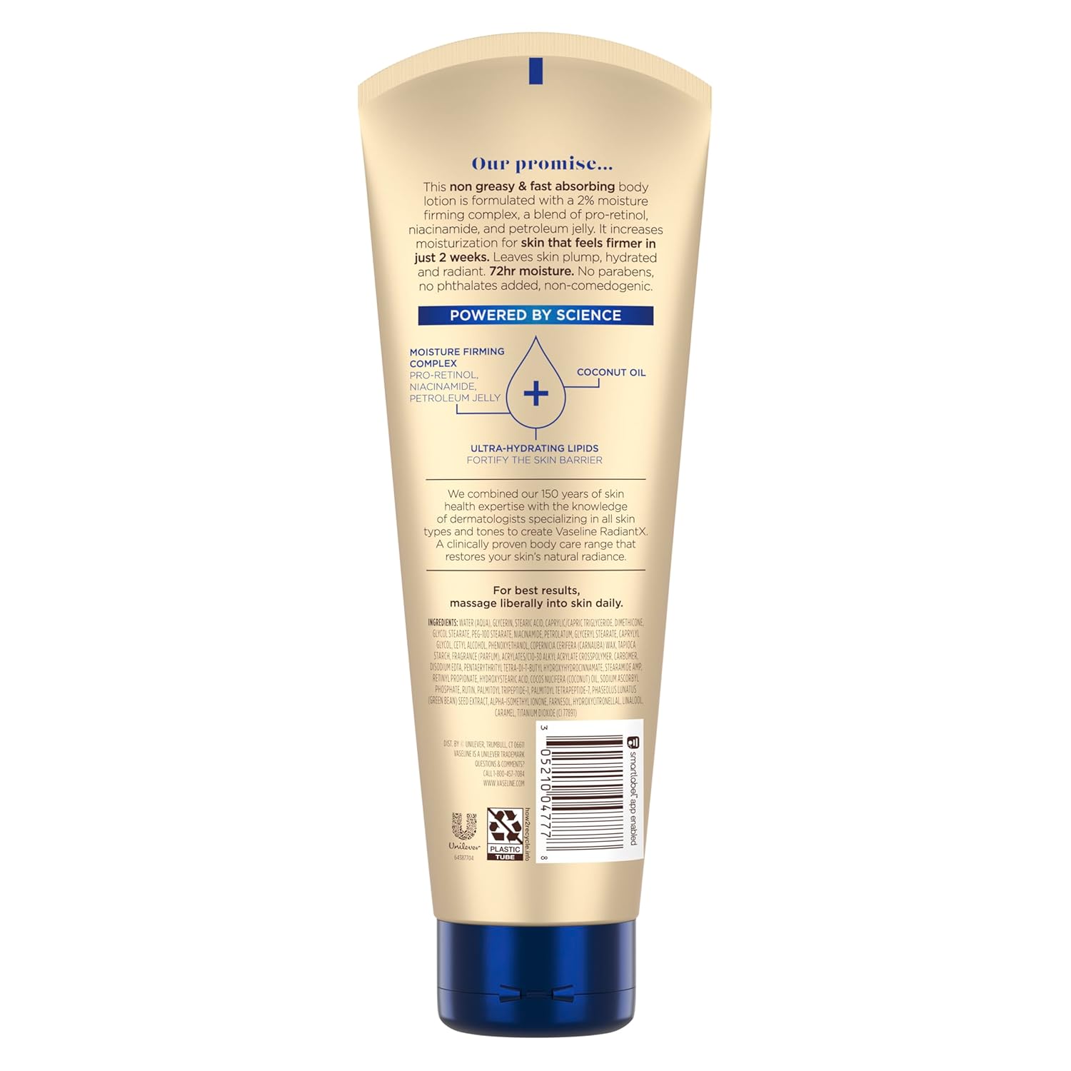 About this item CLINICALLY PROVEN: Vaseline Radiant X Firm & Restore is a fast-absorbing body lotion with 2% Moisture Firming Complex to increase moisturization, leaving skin feeling firmer in just 2 weeks. POWERED BY SCIENCE: Our 2% Moisture Firming Complex is a blend of pro-retinol, niacinamide and petroleum jelly. Additionally, this body lotion is enriched with coconut oil and ultra-hydrating lipids to strengthen your skinās natural barrier. 72HR MOISTURE: Quench your thirsty skin without any greasy residue with our long-lasting Vaseline Radiant X Firm & Restore Nourishing Body Lotion for 72 hours of moisturized and radiant skin. CO-CREATED WITH DERMATOLOGISTS: 150 years of skin health expertise and dermatologists specializing in all skin types and tones created Vaseline Radiant X āproven to restore skin's natural radiance. NOURISHING BODY LOTION: Like all body lotions in the Vaseline Radiant X range of skincare products, Firm & Restore Body Lotion is non-comedogenic and has no parabens and no phthalates added. See more product details,CLINICALLY PROVEN: Vaseline Radiant X Firm & Restore is a fast-absorbing body lotion with 2% Moisture Firming Complex to increase moisturization, leaving skin feeling firmer in just 2 weeks,POWERED BY SCIENCE: Our 2% Moisture Firming Complex is a blend of pro-retinol, niacinamide and petroleum jelly. Additionally, this body lotion is enriched with coconut oil and ultra-hydrating lipids to strengthen your skinās natural barrier,72HR MOISTURE: Quench your thirsty skin without any greasy residue with our long-lasting Vaseline Radiant X Firm & Restore Nourishing Body Lotion for 72 hours of moisturized and radiant skin,CO-CREATED WITH DERMATOLOGISTS: 150 years of skin health expertise and dermatologists specializing in all skin types and tones created Vaseline Radiant X āproven to restore skin's natural radiance,NOURISHING BODY LOTION: Like all body lotions in the Vaseline Radiant X range of skincare products, Firm & Restore Body Lotion is non-comedogenic and has no parabens and no phthalates added