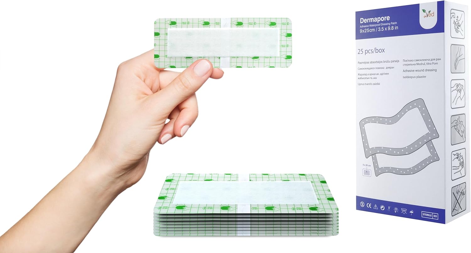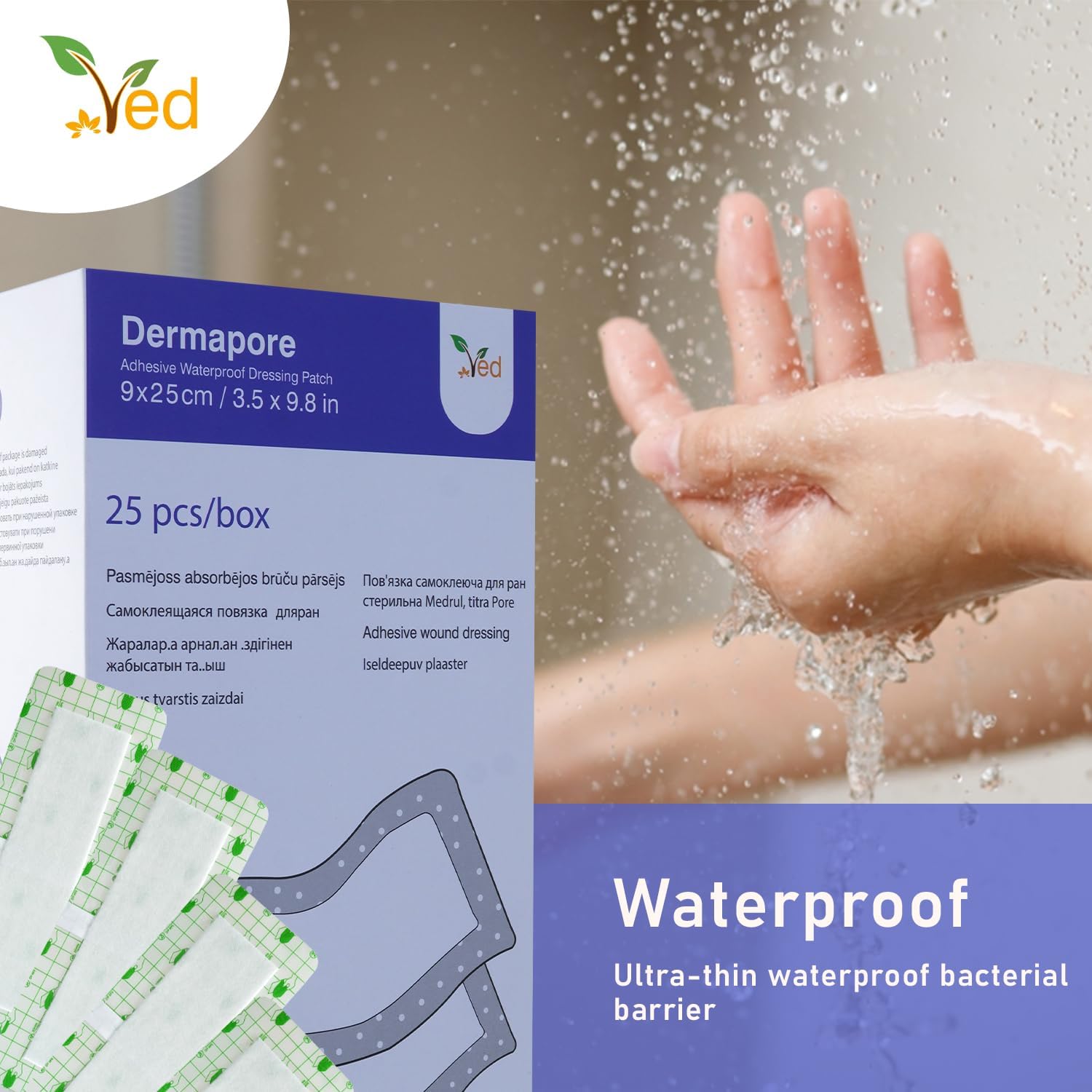 VED Dermapore Waterproof Adhesive Wound Dressing- Suitable for cuts and grazes, Diabetic Leg ulcers, venous Leg ulcers, Small Pressure sores- Medium, 9 x 25cm (Pack of 25)