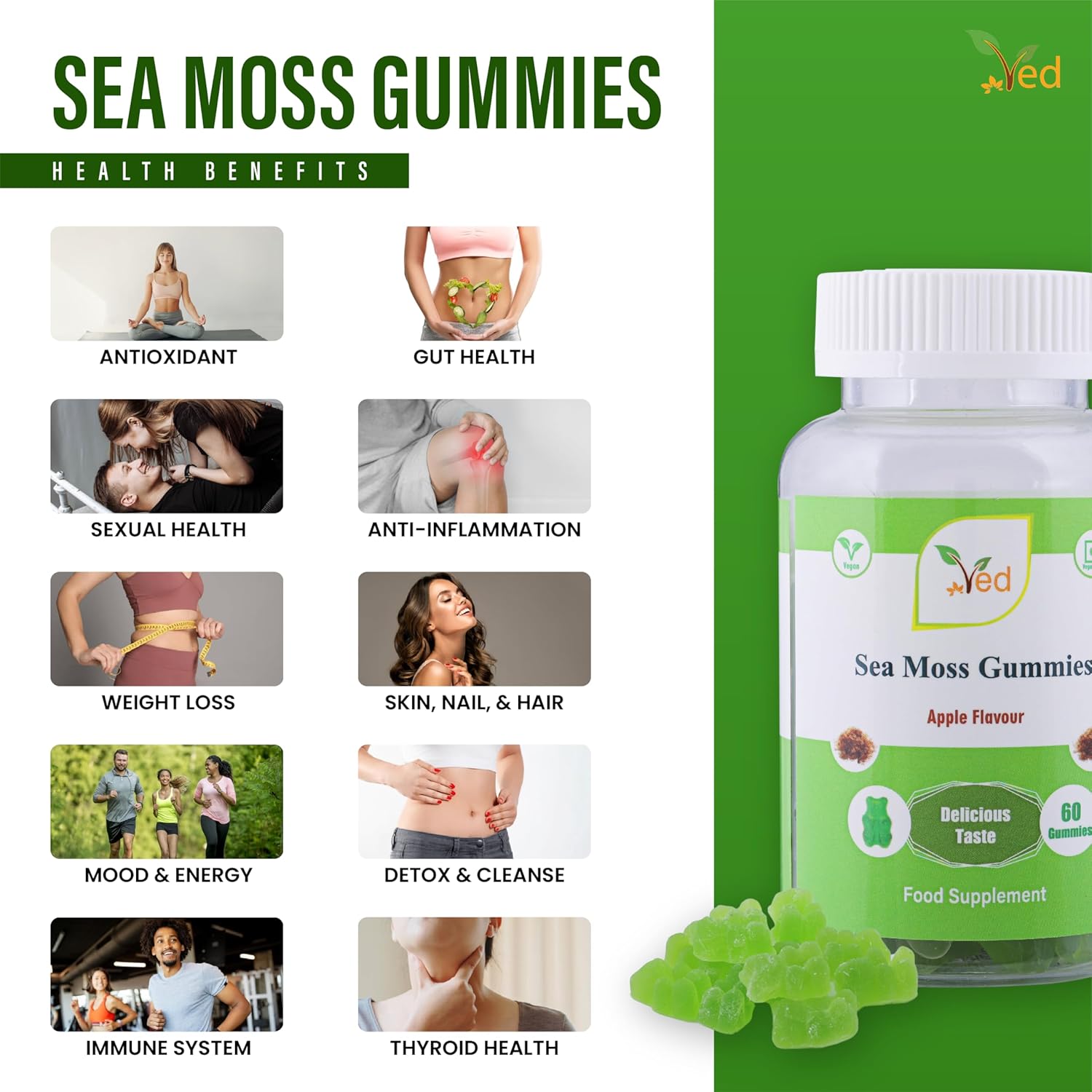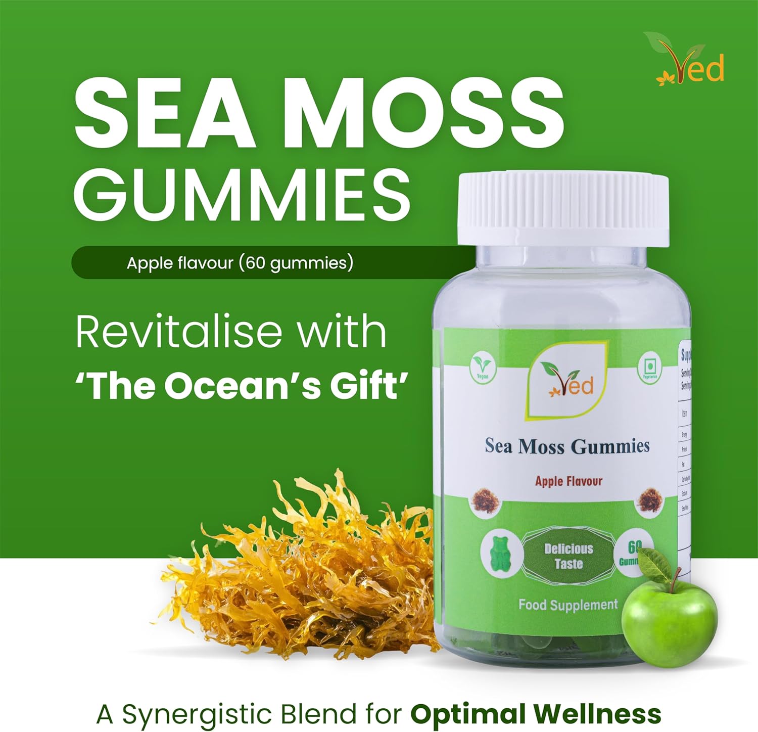 Ved Sea Moss Gummies; Sm Chews Apple Flavour, Raw Unfiltered Sea Moss Gummies With Mother Culture, Vegetarian Vegan Health Supplement For Men And Women- 60 Chews 30 Days’ Supply