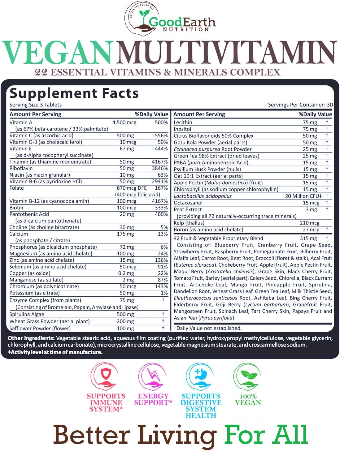 Vegan Multivitamins For Men & Women - Vitamins A , B Complex , C , D3 , Zinc , Magnesium , Spirulina , Antioxidants - Daily Multivitamin Mineral Supplement With Proprietary Fruit & Vegetable Blend