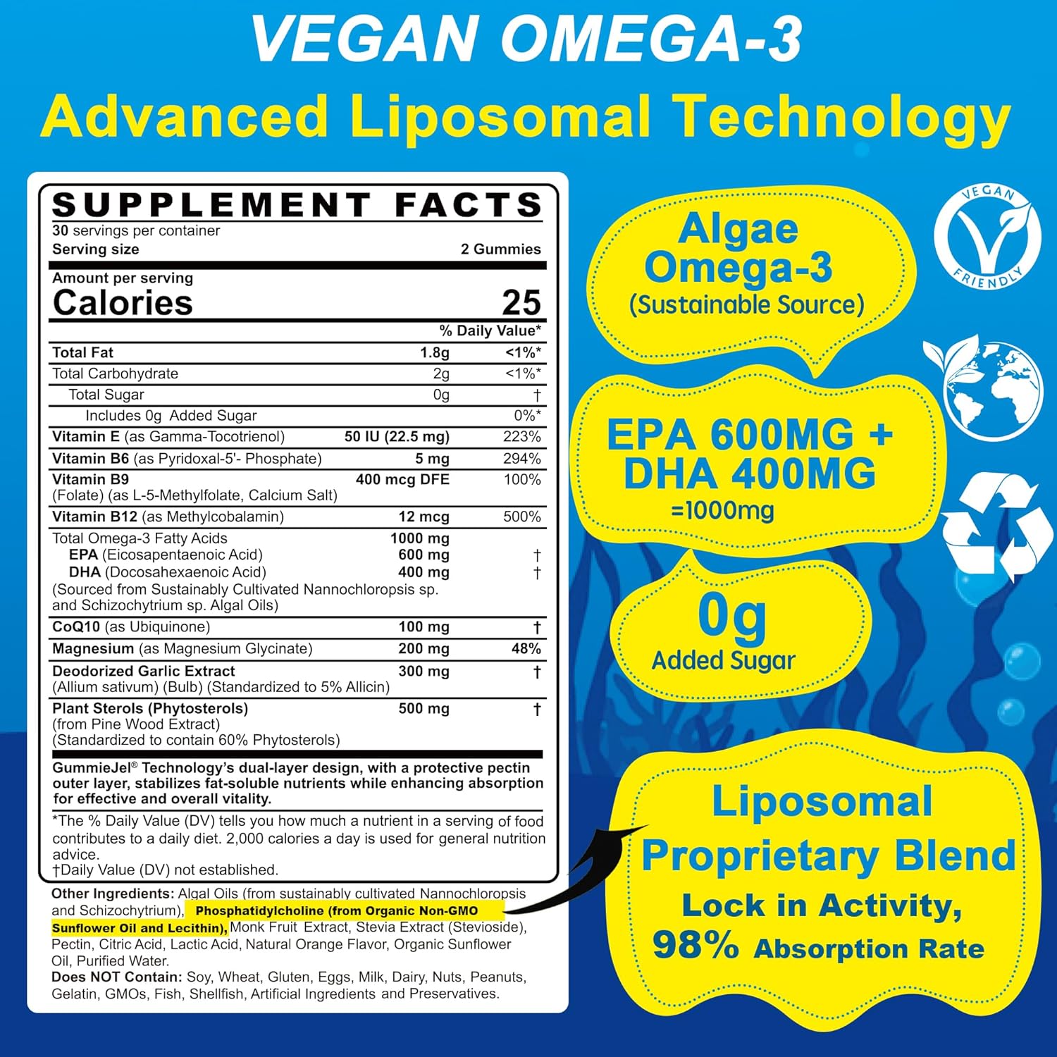 Vegan Omega-3 Gummies 1000Mg +Coq10+Magnesium- Epa 600Mg & Dha 400Mg, Fish Oil Omega 3 Supplements Alternative For Women Men Adults- Liposomal Form -Algae- Plant Sterols, Garlic,B6,B9, B12, Sugar Free