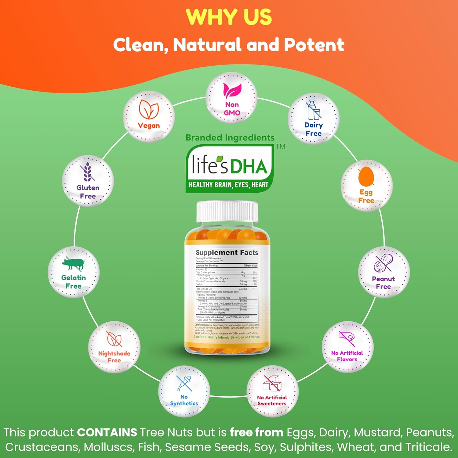 CLEAN AND COMPLETE OMEGA 3 SUPPLEMENT WITH DHA: Omega 3 Gummies are made with DHA, Made with Vitamin C, Chia Seed Oil, and DHA from Algae. With No Fish, Shellfish, High Fructose Syrup and are Major Allergen Free. Complete Vegan Essential Omega Fatty Acid Supplement with DHA for Men and Women, and with Premium Ingredients