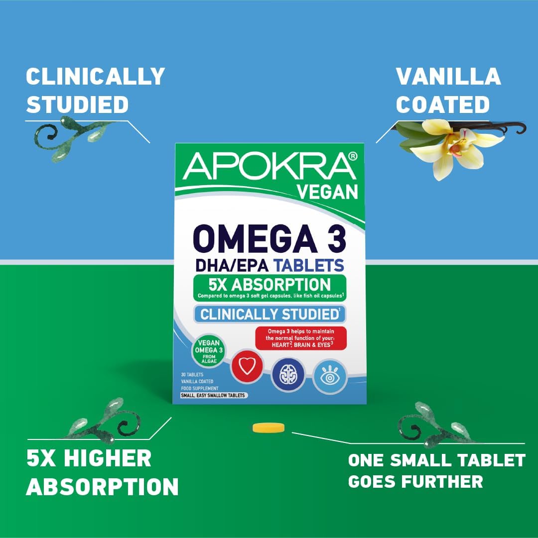 Vegan Omega 3 Tablets From Algae | Fish Free | High In Dha | 5X Absorption | Carrageenan Free | No Heavy Metals | Easy Swallow | 30 Vanilla Coated Tablets | Apokra