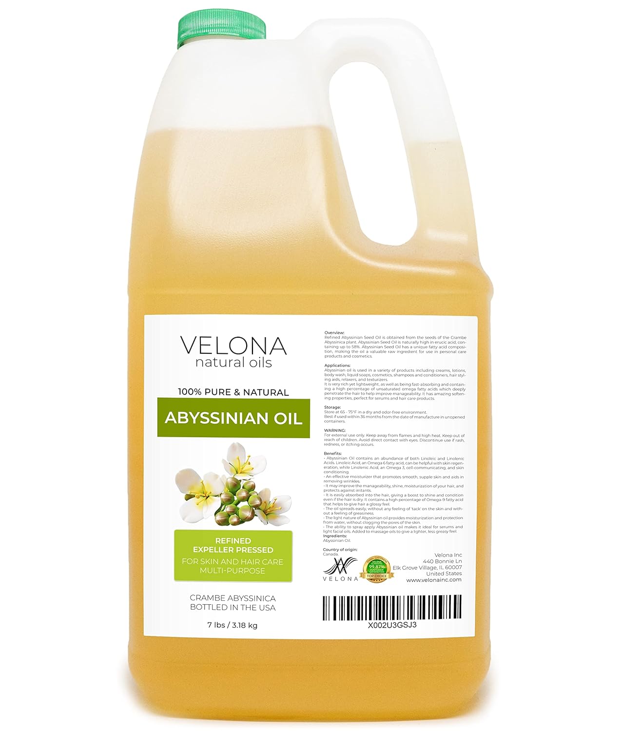Velona Refined Abyssinian Seed Oil is obtained from the seeds of the Crambe Abyssinica plant. Abyssinian Seed Oil is naturally high in erucic acid, containing up to 58%. Abyssinian Seed Oil has a unique fatty acid composition, making the oil a valuable raw ingredient for use in personal care products and cosmetics. Product Specifications Common Name: Abyssinian Oil Botanical Name: Crambe Abyssinica Country of Origin: Canada Extraction Method: Expeller Pressed Plant Part: Abyssinian seed Oil Color: Pale yellow Flavor / Odor / Aroma: Faint woody aroma Abyssinian oil is used in a variety of products including creams, lotions, body wash, liquid soaps, cosmetics, shampoos and conditioners, hair styling aids, relaxers, and texturizers. It is very rich yet lightweight, as well as being fast-absorbing and containing a high percentage of unsaturated omega fatty acids which deeply penetrate the hair to help improve manageability. It has amazing softening properties, perfect for serums and hair care products. 100% Pure & Natural Only One Ingredient: Our premium Abyssinian Oil is 100% Pure & Natural – No Additives, No Chemicals, No Alcohol, No Fragrance and Not Diluted. Non-GMO. Made without pesticides. Frequently Asked Questions Q: Is it really 100% pure What are the ingredients Yes! Abyssinian seed oil, 100% Pure with NO additives or carriers added. Q: What is the best time of year to use Abyssinian oil Abyssinian face oil is recommended to be used at any time of the year – in winter it perfectly protects against frost and cold wind, and in summer against solar ultraviolet and heat. Q: Is Abyssinian oil suitable for problem skin care Yes, Abyssinian oil is used in skin care products (both dry, irritated, and oily, with enlarged pores), as well as in anti-acne products. Q: Can it be used alone or in combination The oil can be combined with any components intended for the preparation of masks for better results. For example, with almond, argan and essential oils. What are carrier oils “Carrier Oil” is a term generally used in the contexts of aromatherapy and cosmetic recipes for natural skin and hair care. Carrier oils and essential oils are made from plants. Carrier oils are used to dilute essential oils and “carry” them to your skin. That’s because essential oils are potent and can cause irritation when applied directly to your skin. A Carrier Oil is a vital aspect of an aromatherapy massage or a natural cosmetic such as a soap, bath oil, body oil, cream, lip balm, lotion, or other moisturizer, as it can affect the usefulness of the massage and the color, scent, therapeutic properties, and shelf life of the final product, respectively. Most carrier oils are unscented or lightly scented and don’t interfere with an essential oil’s therapeutic properties. They may be used alone or with other oils to nourish your skin. Expeller Pressing It is a chemical-free process that involves placing the nuts or seeds in a horizontal press that has an 'expeller,' which is a rotating screw. The screw drives the nuts and seeds through a barrel-shaped hollow and compresses them until the high pressure squeezes out the oil, which seeps out through the opening, while the ‘meal,’ or the debris, remains inside the barrel. The oil is then filtered, resulting in the finished product. Due to the absence of solvent residues in Expeller Pressing, the outcome is cleaner, purer oils that are higher in natural colors and scents. (function(f) {var _np=(window.P._namespace("AplusModule"));if(_np.guardFatal){_np.guardFatal(f)(_np);}else{f(_np);}}(function(P) { // register javascript with unique module id P.when("jQuery", "AplusModules-module-6", "ready").execute(function($, hoverModule) { hoverModule("aplus-module-6-3"); }); })); Benefits & Uses Absorbs quickly without clogging pores Abyssinian oil is characterized by low viscosity, thanks to which it is absorbed very quickly and is able to penetrate deep dermal layers. The product is so light that it can be used in the form of an oil spray, which does not leave a greasy feeling and at the same time creates an invisible, gentle barrier film on the skin surface. Moisturizes and softens the skin The presence of long-chain triglycerides and unsaturated fatty acids, including omega-9, thanks to which Abyssinian oil has an exceptional moisturizing effect and protects the epidermis from dehydration. Due to the high content of antioxidants, the oil stimulates the production of collagen, thanks to which the elasticity of the epidermis is preserved. Restores structure and smoothes hair In hair care, Abyssinian oil smoothes the surface of the hair, forming a very light and thin layer of lipids that provides shine, helps to detangle the hair and retain moisture. Abyssinian oil copes well with dry and damaged strands. Smooths out small wrinkles Many bioactive components give radiance and vitality to dull and tired skin, deeply nourishes, tones and strengthens the epidermis, slows down the aging process, smoothes fine wrinkles. With regular use, it reduces pigmentation, evens out the tone of the face. Neem Oil Lanolin Oil Sweet Almond Oil Jojoba Oil Castor Oil Pumpkin Seed Oil Add to Cart Add to Cart See Details Add to Cart See Details Add to Cart Customer Reviews .aplus-v2 .aplus-review-right-padding { padding-right: 0.1rem; } 4.6 out of 5 stars 3,949 .aplus-v2 .aplus-review-right-padding { padding-right: 0.1rem; } 4.7 out of 5 stars 1,504 .aplus-v2 .aplus-review-right-padding { padding-right: 0.1rem; } — .aplus-v2 .aplus-review-right-padding { padding-right: 0.1rem; } 4.6 out of 5 stars 3,949 .aplus-v2 .aplus-review-right-padding { padding-right: 0.1rem; } — .aplus-v2 .aplus-review-right-padding { padding-right: 0.1rem; } 4.6 out of 5 stars 3,949 Price $14.95 $ 14 . 95 $30.46 $ 30 . 46 — $19.95 $ 19 . 95 — $15.95 $ 15 . 95 Pure & Natural Best for Hair care Skin care Skin care Skin care Eyelashes & brows Skin care Bottle Material Amber BPA-Free plastic Amber BPA-F