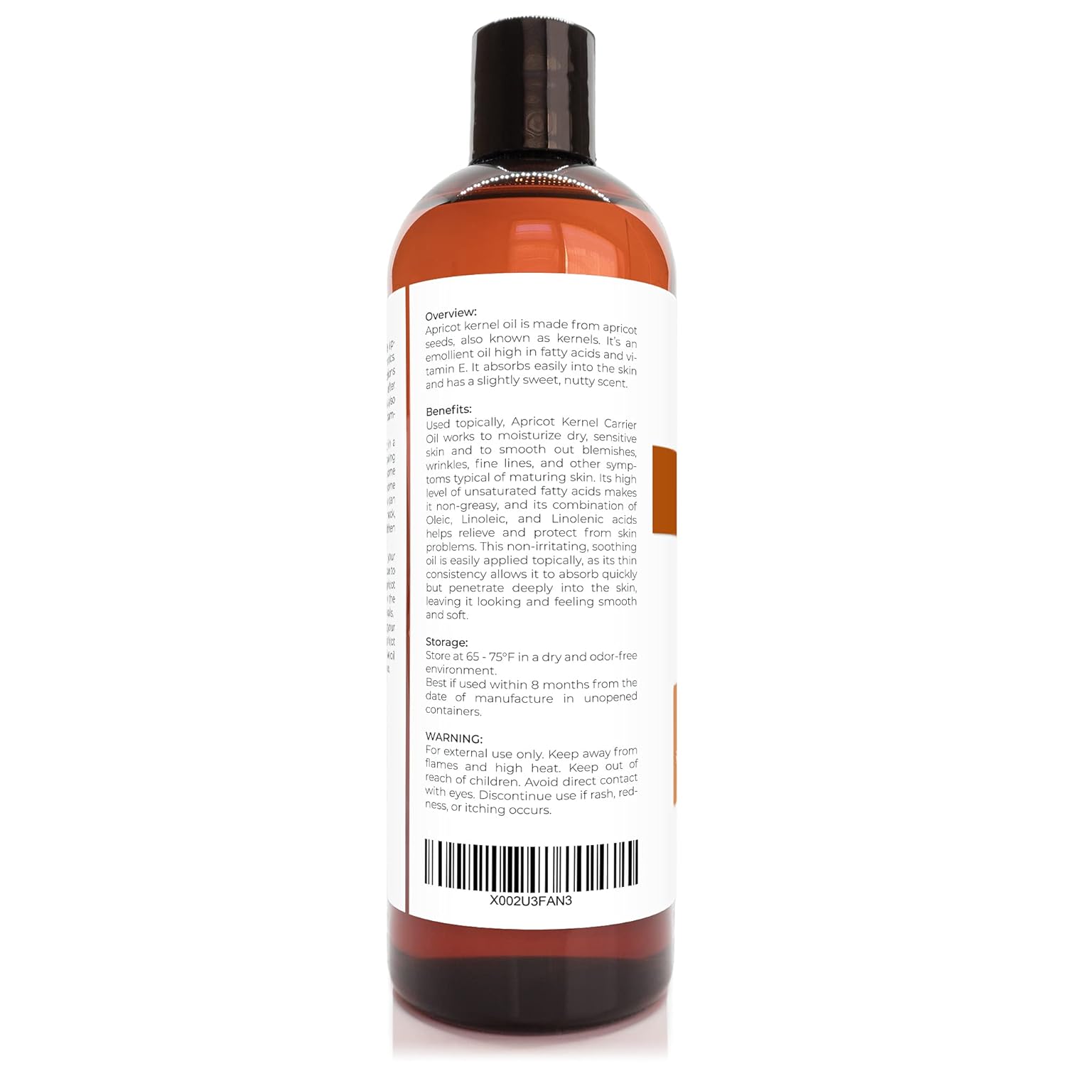 Apricot Kernel Oil: 100% Pure and Natural Carrier Oil. Refined. Expeller Pressed. Not Diluted, Non-GMO, No Additives, No Fragrance, Chemical Free, Alcohol Free. All our products are bottled in the USA