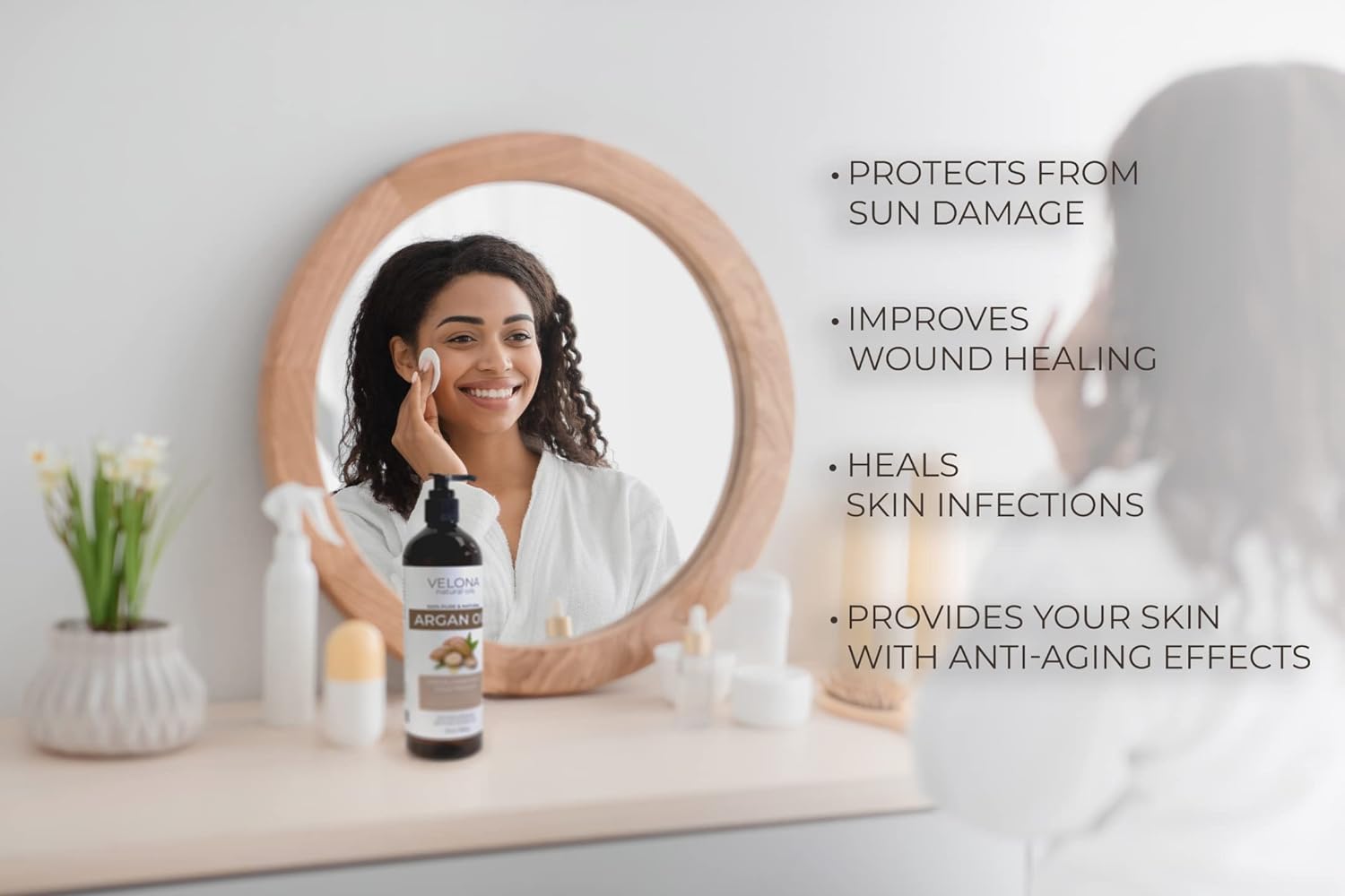 100% Pure & Natural Argan oil is mostly used as a moisturizer for skin and hair because it is full of fatty acids, mainly oleic acid and linoleic acid. These oils have been shown to lubricate the hair shaft and help your hair maintain moisture. Argan oil also known as Morocco oil, is also rich in vitamin E, which provides a fatty layer to your hair and scalp that may help with dryness, fizziness and boost shine. IMPORTANT! We sell our products by weight, not by volume! That is, different kind of oils might have different volume while the same bottle size and weight as they have different viscosity. Product Specifications Common Name: Argan Oil/ Morocco Oil Botanical Name: Argania Spinosa Country of Origin: Morocco Extraction Method: Cold Pressed Oil Color: Golden yellow Flavor / Odor / Aroma: Toasted, creamy, nutty Argan oil (Morocco oil) is usually used topically in its pure form — but also frequently included in cosmetic products like lotions and skin creams. You can apply argan oil directly to damp or dry hair to increase moisture, eliminate breakage, fine lines and wrinkles. It is also sometimes included in shampoos or conditioners. If it’s your first time using it, start with a small amount to see how your hair responds. If you have naturally oily roots, apply argan only to the ends of your hair to avoid greasy-looking hair. 100% Pure & Natural Only One Ingredient: Our Argan Oil is 100% Pure & Natural – No Additives, No Chemicals, No Alcohol, No Fragrance, and Not Diluted. Non-GMO. Made without pesticides. Frequently Asked Questions Q: Is it really 100% pure What are the ingredients Yes! there is only one ingredient: 100% Pure & Natural Argan Oil (Argania Spinosa). Q: Can I use Argan Oil on Oily Skin Yes. The oil is well-known for being non-comedogenic which means it will not clog your pores; the oil is rich in unsaturated fatty acids, therefore Argan Oil has a very high absorption rate. Q: I have acne on my skin, is argan oil okay for me to use Yes, argan oil is good for acne skin. Argan oil regulates the production of sebum, which causes acne, its use can help reduce further breakouts. Q: Is it safe to leave argan oil in my hair everyday 24/7 Yes, as long as you use 100% pure & natural Velona Argan Oil. What are carrier oils “Carrier Oil” is a term generally used in the contexts of aromatherapy and cosmetic recipes for natural skin and hair care. Carrier oils and essential oils are made from plants. Carrier oils are used to dilute essential oils and “carry” them to your skin. That’s because essential oils are potent and can cause irritation when applied directly to your skin. A Carrier Oil is a vital aspect of an aromatherapy massage or a natural cosmetic such as a soap, bath oil, body oil, cream, lip balm, lotion, or other moisturizer, as it can affect the usefulness of the massage and the color, scent, therapeutic properties, and shelf life of the final product, respectively. Most carrier oils are unscented or lightly scented and don’t interfere with an essential oil’s therapeutic properties. They may be used alone or with other oils to nourish your skin. Cold Pressing It is a chemical-free process that involves placing the nuts or seeds in a horizontal press that has an 'expeller,' which is a rotating screw. The screw drives the nuts and seeds through a barrel-shaped hollow and compresses them until the high pressure squeezes out the oil, which seeps out through the opening, while the ‘meal,’ or the debris, remains inside the barrel. The oil is then filtered, resulting in the finished product. Due to the absence of solvent residues in Cold Pressing, the outcome is cleaner, purer oils that are higher in natural colors and scents. (function(f) {var _np=(window.P._namespace("AplusModule"));if(_np.guardFatal){_np.guardFatal(f)(_np);}else{f(_np);}}(function(P) { // register javascript with unique module id P.when("jQuery", "AplusModules-module-6", "ready").execute(function($, hoverModule) { hoverModule("aplus-module-6-3"); }); })); Benefits & Uses Decrease wrinkles Because it’s so nourishing, argan oil may also help your skin appear more youthful. When we talk about thinning of the skin as we get older, we lose both collagen (the building blocks of skin) and the elasticity (the skin’s ability to snap back after being stretched), which leads to tissue paper-like wrinkling of the skin. When used topically, argan oil has been found to increase elasticity of the skin in postmenopausal women. Help skin and face with dark spots If you suffer from hyperpigmentation, or brown spots on the skin caused by hormones, aging, or years of sun exposure, argan oil may help better the condition of your skin tone. Argan oil contains tocopherols (vitamin E compounds) that can inhibit the production of excess pigment from melasma or scars. Other studies also suggest that it may even help speed up recovering from burn scars. Add sun protection Argan oil works like a high-quality sunscreen for your hair, neutralizing free radicals enhanced by the natural environment and sun. The antioxidants found in argan oil are especially beneficial for color-treated hair to avoid loss of pigment and extend the life of your color. An easy way to introduce using argan oil as a sun protectant it is by adding one to two drops and lightly running your fingers through your hair after styling or just adding it to the ends. Encourage hair growth Because of the phenols found in argan oil, which are very stimulating to the scalp, it can help to promote new hair growth. The best way to reap these benefits is in tandem with a hair loss treatment. We recommend massaging the oil into your scalp for several minutes a day to stimulate blood flow and open the pores. Neem Oil Lanolin Oil Sweet Almond Oil Amla Oil Jojoba Oil Pumpkin Seed Oil Add to Cart Add to Cart See Details Add to Cart Add to Cart Add to Cart Customer Reviews .aplus-v2 .aplus-review-right-padding { padding-right: 0.1rem; } 4.6 out of 5 sta
