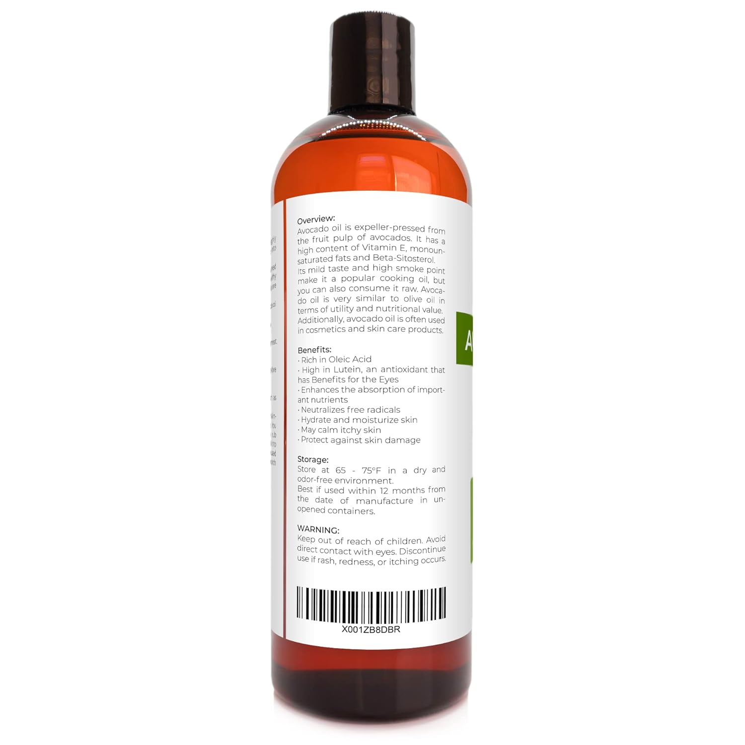 Avocado oil is expeller-pressed from the fruit pulp of avocados. It has a high content of Vitamin E, monounsaturated fats and Beta-Sitosterol. After application, the oil leaves the skin soft and tender, preventing it from drying out. Product Specifications Common Name: Avocado Oil Botanical Name: Persea Americana Country of Origin: South Africa & Mexico Extraction Method: Expeller Pressed Plant Part: Avocado fruit Oil Color: Light yellow and almost clear Flavor / Odor / Aroma: Between nutty and grassy It’s the fact that avocado oil is highly versatile and easy to incorporate into your diet. For example, it can be consumed cold, but it’s also a safe and healthy cooking oil because its fatty acids are stable at high heat. You can use avocado oil in your skincare routine in a variety of ways. You can massage the oil on your skin, rub it on your face like a mask, or add it to your in-shower lotion. It can be used every day or a few times a month without any adverse effects. 100% Pure & Natural Only One Ingredient: Avocado Oil is 100% Pure & Natural. Non-GMO. Made without pesticides. Frequently Asked Questions Q: Is it really 100% pure What are the ingredients Yes! There is only one ingredient: 100% Pure & Natural Avocado Oil. Q: Do you use avocado oil for hair Of course, it is especially useful to use a product for curls that are dyed too often, it allows you to restore the attractiveness of even severely damaged strands. Q: Does avocado oil lose all its beneficial properties when heated Not quite so. Avocado oil is added to dishes in a cold form and used for frying. When heated, the product loses some of its useful properties, but does not change its taste and does not burn. Q: What are the contraindications for using avocado oil There are quite a few prohibitions on the use of useful oil. The main precaution is individual intolerance of the product. Before adding avocado pulp to food for the first time, it is necessary to make sure that there is no allergy. What are carrier oils “Carrier Oil” is a term generally used in the contexts of aromatherapy and cosmetic recipes for natural skin and hair care. Carrier oils and essential oils are made from plants. Carrier oils are used to dilute essential oils and “carry” them to your skin. That’s because essential oils are potent and can cause irritation when applied directly to your skin. A Carrier Oil is a vital aspect of an aromatherapy massage or a natural cosmetic such as a soap, bath oil, body oil, cream, lip balm, lotion, or other moisturizer, as it can affect the usefulness of the massage and the color, scent, therapeutic properties, and shelf life of the final product, respectively. Most carrier oils are unscented or lightly scented and don’t interfere with an essential oil’s therapeutic properties. They may be used alone or with other oils to nourish your skin. Expeller Pressing It is a chemical-free process that involves placing the nuts or seeds in a horizontal press that has an 'expeller,' which is a rotating screw. The screw drives the nuts and seeds through a barrel-shaped hollow and compresses them until the high pressure squeezes out the oil, which seeps out through the opening, while the ‘meal,’ or the debris, remains inside the barrel. The oil is then filtered, resulting in the finished product. Due to the absence of solvent residues in Expeller Pressing, the outcome is cleaner, purer oils that are higher in natural colors and scents. (function(f) {var _np=(window.P._namespace("AplusModule"));if(_np.guardFatal){_np.guardFatal(f)(_np);}else{f(_np);}}(function(P) { // register javascript with unique module id P.when("jQuery", "AplusModules-module-6", "ready").execute(function($, hoverModule) { hoverModule("aplus-module-6-3"); }); })); Benefits & Uses The maximum number of valuable components • Omega-6 and Omega-3 acids • vitamins B1, B2 and B12, retinol, vitamin D3 • calcium and manganese • amino, linoleic and palmitoleic acids and others Has powerful nourishing properties Avocado oil has powerful nourishing properties, stimulates cell regeneration, heals damaged areas of the epidermis and makes it elastic. When used externally and internally, the product has a moisturizing and rejuvenating effect. Has an SPF Known as “beauty oil”. The oil restores the barrier functions of the epidermis and local immunity of the skin. Contains fat-soluble vitamins A and E, which have antioxidant properties. Well, as a natural sunscreen, avocado oil reflects ultraviolet radiation and has a sun protection factor (SPF) of 2-4. Use of avocado oil in cooking The product is valued not only for its useful properties, but also for its taste and pleasant aroma. In cooking, it is used everywhere, and it is especially often used for dressing vegetable salads, for frying fish and seafood, when preparing soups, etc. Neem Oil Lanolin Oil Sweet Almond Oil Jojoba Oil Castor Oil Pumpkin Seed Oil Add to Cart Add to Cart See Details Add to Cart See Details Add to Cart Customer Reviews .aplus-v2 .aplus-review-right-padding { padding-right: 0.1rem; } 4.6 out of 5 stars 3,949 .aplus-v2 .aplus-review-right-padding { padding-right: 0.1rem; } 4.7 out of 5 stars 1,504 .aplus-v2 .aplus-review-right-padding { padding-right: 0.1rem; } — .aplus-v2 .aplus-review-right-padding { padding-right: 0.1rem; } 4.6 out of 5 stars 3,949 .aplus-v2 .aplus-review-right-padding { padding-right: 0.1rem; } — .aplus-v2 .aplus-review-right-padding { padding-right: 0.1rem; } 4.6 out of 5 stars 3,949 Price $14.95 $ 14 . 95 $30.46 $ 30 . 46 — $19.95 $ 19 . 95 — $15.95 $ 15 . 95 Pure & Natural Best for Hair care Skin care Skin care Skin care Eyelashes & brows Skin care Bottle Material Amber BPA-Free plastic Amber BPA-Free plastic Amber BPA-Free plastic Amber BPA-Free plastic Amber BPA-Free plastic Amber BPA-Free plastic Cold Pressed Unrefined Non-GMO ORGANIC At VELONA, we believe that natural products are the key to a happy life. We source only pure and high-q