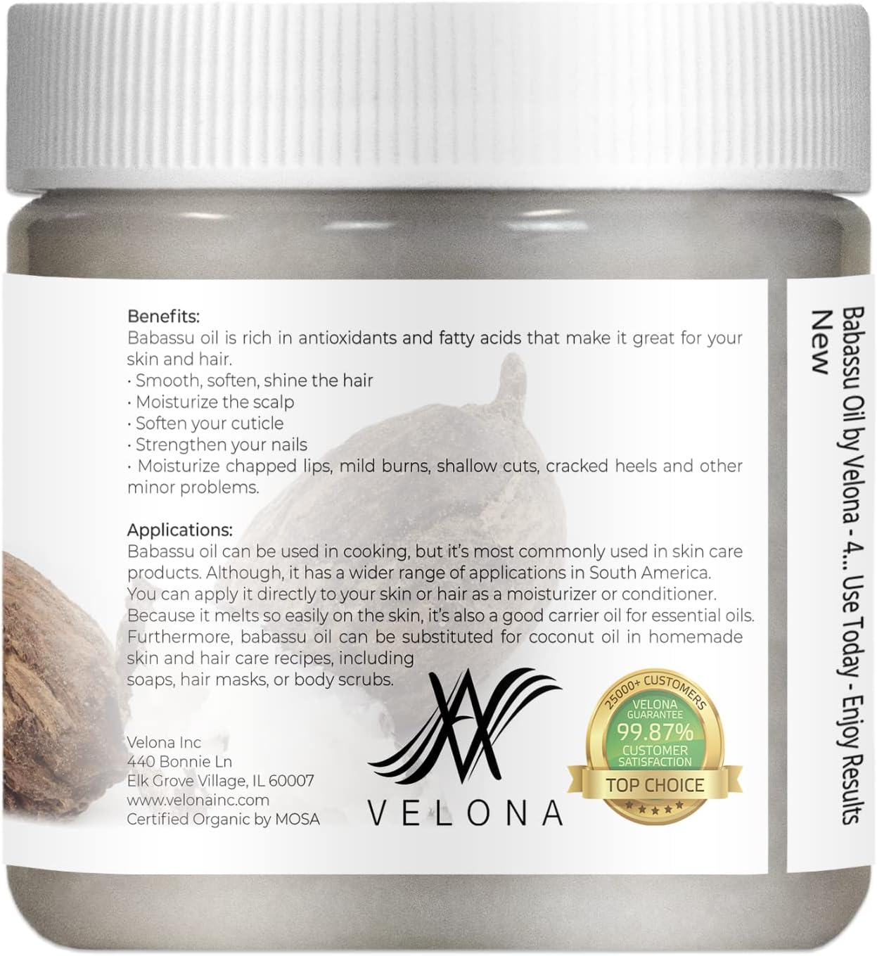 velona Babassu Oil USDA Certified Organic - 4 oz | 100% Pure and Natural Carrier Oil | Refined, Cold Pressed | Face, Hair, Body & Skin Care and Cooking | Use Today - Enjoy Results