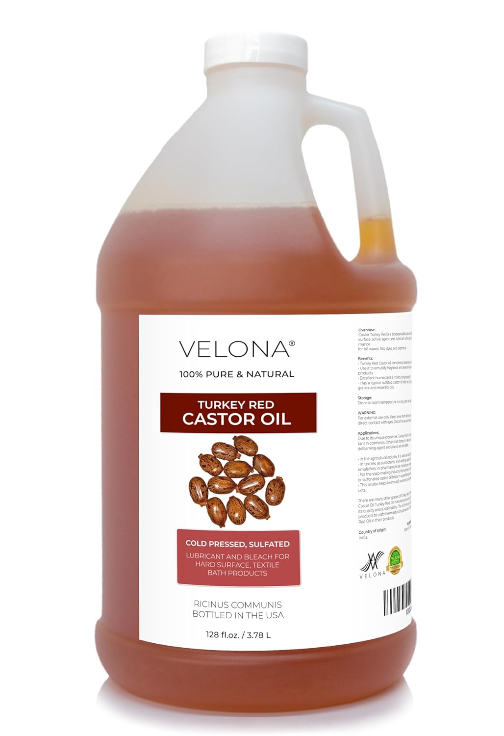 Castor Turkey Red is an aqueous solution of sulfated castor oil. It is a low-foaming surface active agent and lubricant which provides effective dispersing and emulsifying performance for oil, waxes, fats, dyes, and pigments. IMPORTANT! We sell our products by weight, not by volume! That is, different kind of oils might have different volume while the same bottle size and weight as they have different viscosity. Product Specifications Common Name: Turkey Red Castor Oil Botanical Name: Ricinus Communis Country of Origin: India Extraction Method: Cold Pressed Plant Part: Seeds Oil Color: Orangey-red Flavor / Odor / Aroma: Distinct and heavy scent Due to its unique properties, Turkey Red Oil is used for bath oils and in cosmetics. Other than these, it is also used in the textile industry and sugar industries. • In the agricultural industry, it is used as natural manure and helps plants to grow. • In textiles, as surfactants and wetting agents, in paper industry, in cosmetics, in pharmaceuticals industry • For the soap-making industry that wishes to manufacture transparent soaps. 100% Pure & Natural Only One Ingredient: Our premium Turkey Red Castor Oil is 100% Pure & Natural – No Additives, No Chemicals, No Alcohol, No Fragrance, and Not Diluted. Non-GMO. Made without pesticides. Frequently Asked Questions Q: Is it really 100% pure What are the ingredients Yes! there is only one ingredient: 100% Pure & Natural Turkey Red Castor Oil (Ricinus Communis). Q: Does it disperse in water Yes, Turkey Red Castor oil completely disperses in water. Q: How to Work with It Use it to create bath products that emulsify into your bathwater, and to emulsify small amounts of oil in larger amounts of water (things like room sprays and hair mists). Q: Can I use it as a lubricant for textile Yes, it is commonly used in textile, metal working and printing operations to provide continuous cleaning and lubrication to metal parts. What are carrier oils “Carrier Oil” is a term generally used in the contexts of aromatherapy and cosmetic recipes for natural skin and hair care. Carrier oils and essential oils are made from plants. Carrier oils are used to dilute essential oils and “carry” them to your skin. That’s because essential oils are potent and can cause irritation when applied directly to your skin. A Carrier Oil is a vital aspect of an aromatherapy massage or a natural cosmetic such as a soap, bath oil, body oil, cream, lip balm, lotion, or other moisturizer, as it can affect the usefulness of the massage and the color, scent, therapeutic properties, and shelf life of the final product, respectively. Most carrier oils are unscented or lightly scented and don’t interfere with an essential oil’s therapeutic properties. They may be used alone or with other oils to nourish your skin. Cold Pressing It is a chemical-free process that involves placing the nuts or seeds in a horizontal press that has an 'expeller'. It drives the nuts and seeds through a barrel-shaped hollow and compresses them until the high pressure squeezes out the oil, which seeps out through the opening, while the ‘meal,’ or the debris, remains inside the barrel. The oil is then filtered, resulting in the finished product. Due to the absence of solvent residues in Cold Pressing, the outcome is cleaner, purer oils that are higher in natural colors and scents. (function(f) {var _np=(window.P._namespace("AplusModule"));if(_np.guardFatal){_np.guardFatal(f)(_np);}else{f(_np);}}(function(P) { // register javascript with unique module id P.when("jQuery", "AplusModules-module-6", "ready").execute(function($, hoverModule) { hoverModule("aplus-module-6-3"); }); })); Benefits & Uses Easily mixes in water Castor Oil Turkey Red oil is very useful since it will completely disperse in water. Castor Turkey Red is a common addition to bath products, natural soaps, lotions etc. It is the only oil that will completely disperse in water. Keeps moisture The oil’s medium viscosity helps the manufacturers of personal care products to craft the moisturizing products in the best way possible due to the presence of Turkey Red Oil in their products. Excellent lubricant It is an excellent lubricant for textile scouring and bleaching operations for both knit and woven goods. It is commonly used in textile, metal working and printing operations to provide continuous cleaning and lubrication to metal parts. It is often used as a component of general purpose hard surface cleaners. Massage Oil Turkey Red Oil is a thick oil. It seems initially sticky, but with addition of another carrier, it has the right slip to move over skin easily. It will also remain on the skin long enough to provide a good massage. Castor Oil Turkey Red – 80% Jojoba Oil – 18% Essential Oil – 2% Neem Oil Lanolin Oil Sweet Almond Oil Amla Oil Jojoba Oil Pumpkin Seed Oil Add to Cart Add to Cart See Details Add to Cart Add to Cart Add to Cart Customer Reviews .aplus-v2 .aplus-review-right-padding { padding-right: 0.1rem; } 4.6 out of 5 stars 3,949 .aplus-v2 .aplus-review-right-padding { padding-right: 0.1rem; } 4.7 out of 5 stars 1,504 .aplus-v2 .aplus-review-right-padding { padding-right: 0.1rem; } — .aplus-v2 .aplus-review-right-padding { padding-right: 0.1rem; } 4.6 out of 5 stars 3,949 .aplus-v2 .aplus-review-right-padding { padding-right: 0.1rem; } 4.6 out of 5 stars 3,949 .aplus-v2 .aplus-review-right-padding { padding-right: 0.1rem; } 4.6 out of 5 stars 3,949 Price $14.95 $ 14 . 95 $30.46 $ 30 . 46 — $22.99 $ 22 . 99 $19.95 $ 19 . 95 $15.95 $ 15 . 95 100% Pure & Natural Best for Hair care Skin care Skin care Hair care Skin care Skin care Bottle Material Amber BPA-Free plastic Amber BPA-Free plastic Amber BPA-Free plastic Amber BPA-Free plastic Amber BPA-Free plastic Amber BPA-Free plastic Cold Pressed Unrefined Non-GMO ORGANIC At VELONA, we believe that natural products are the key to a happy life. We source only pure and high-quality ingredients and we stand behind e