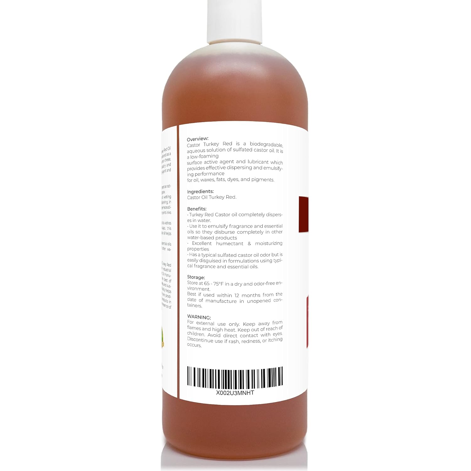 Castor Turkey Red is an aqueous solution of sulfated castor oil. It is a low-foaming surface active agent and lubricant which provides effective dispersing and emulsifying performance for oil, waxes, fats, dyes, and pigments. IMPORTANT! We sell our products by weight, not by volume! That is, different kind of oils might have different volume while the same bottle size and weight as they have different viscosity. Product Specifications Common Name: Turkey Red Castor Oil Botanical Name: Ricinus Communis Country of Origin: India Extraction Method: Cold Pressed Plant Part: Seeds Oil Color: Orangey-red Flavor / Odor / Aroma: Distinct and heavy scent Due to its unique properties, Turkey Red Oil is used for bath oils and in cosmetics. Other than these, it is also used in the textile industry and sugar industries. • In the agricultural industry, it is used as natural manure and helps plants to grow. • In textiles, as surfactants and wetting agents, in paper industry, in cosmetics, in pharmaceuticals industry • For the soap-making industry that wishes to manufacture transparent soaps. 100% Pure & Natural Only One Ingredient: Our premium Turkey Red Castor Oil is 100% Pure & Natural – No Additives, No Chemicals, No Alcohol, No Fragrance, and Not Diluted. Non-GMO. Made without pesticides. Frequently Asked Questions Q: Is it really 100% pure What are the ingredients Yes! there is only one ingredient: 100% Pure & Natural Turkey Red Castor Oil (Ricinus Communis). Q: Does it disperse in water Yes, Turkey Red Castor oil completely disperses in water. Q: How to Work with It Use it to create bath products that emulsify into your bathwater, and to emulsify small amounts of oil in larger amounts of water (things like room sprays and hair mists). Q: Can I use it as a lubricant for textile Yes, it is commonly used in textile, metal working and printing operations to provide continuous cleaning and lubrication to metal parts. What are carrier oils “Carrier Oil” is a term generally used in the contexts of aromatherapy and cosmetic recipes for natural skin and hair care. Carrier oils and essential oils are made from plants. Carrier oils are used to dilute essential oils and “carry” them to your skin. That’s because essential oils are potent and can cause irritation when applied directly to your skin. A Carrier Oil is a vital aspect of an aromatherapy massage or a natural cosmetic such as a soap, bath oil, body oil, cream, lip balm, lotion, or other moisturizer, as it can affect the usefulness of the massage and the color, scent, therapeutic properties, and shelf life of the final product, respectively. Most carrier oils are unscented or lightly scented and don’t interfere with an essential oil’s therapeutic properties. They may be used alone or with other oils to nourish your skin. Cold Pressing It is a chemical-free process that involves placing the nuts or seeds in a horizontal press that has an 'expeller'. It drives the nuts and seeds through a barrel-shaped hollow and compresses them until the high pressure squeezes out the oil, which seeps out through the opening, while the ‘meal,’ or the debris, remains inside the barrel. The oil is then filtered, resulting in the finished product. Due to the absence of solvent residues in Cold Pressing, the outcome is cleaner, purer oils that are higher in natural colors and scents. (function(f) {var _np=(window.P._namespace("AplusModule"));if(_np.guardFatal){_np.guardFatal(f)(_np);}else{f(_np);}}(function(P) { // register javascript with unique module id P.when("jQuery", "AplusModules-module-6", "ready").execute(function($, hoverModule) { hoverModule("aplus-module-6-3"); }); })); Benefits & Uses Easily mixes in water Castor Oil Turkey Red oil is very useful since it will completely disperse in water. Castor Turkey Red is a common addition to bath products, natural soaps, lotions etc. It is the only oil that will completely disperse in water. Keeps moisture The oil’s medium viscosity helps the manufacturers of personal care products to craft the moisturizing products in the best way possible due to the presence of Turkey Red Oil in their products. Excellent lubricant It is an excellent lubricant for textile scouring and bleaching operations for both knit and woven goods. It is commonly used in textile, metal working and printing operations to provide continuous cleaning and lubrication to metal parts. It is often used as a component of general purpose hard surface cleaners. Massage Oil Turkey Red Oil is a thick oil. It seems initially sticky, but with addition of another carrier, it has the right slip to move over skin easily. It will also remain on the skin long enough to provide a good massage. Castor Oil Turkey Red – 80% Jojoba Oil – 18% Essential Oil – 2% Neem Oil Lanolin Oil Sweet Almond Oil Amla Oil Jojoba Oil Pumpkin Seed Oil Add to Cart Add to Cart See Details Add to Cart Add to Cart Add to Cart Customer Reviews .aplus-v2 .aplus-review-right-padding { padding-right: 0.1rem; } 4.6 out of 5 stars 3,949 .aplus-v2 .aplus-review-right-padding { padding-right: 0.1rem; } 4.7 out of 5 stars 1,504 .aplus-v2 .aplus-review-right-padding { padding-right: 0.1rem; } — .aplus-v2 .aplus-review-right-padding { padding-right: 0.1rem; } 4.6 out of 5 stars 3,949 .aplus-v2 .aplus-review-right-padding { padding-right: 0.1rem; } 4.6 out of 5 stars 3,949 .aplus-v2 .aplus-review-right-padding { padding-right: 0.1rem; } 4.6 out of 5 stars 3,949 Price $14.95 $ 14 . 95 $30.46 $ 30 . 46 — $22.99 $ 22 . 99 $19.95 $ 19 . 95 $15.95 $ 15 . 95 100% Pure & Natural Best for Hair care Skin care Skin care Hair care Skin care Skin care Bottle Material Amber BPA-Free plastic Amber BPA-Free plastic Amber BPA-Free plastic Amber BPA-Free plastic Amber BPA-Free plastic Amber BPA-Free plastic Cold Pressed Unrefined Non-GMO ORGANIC At VELONA, we believe that natural products are the key to a happy life. We source only pure and high-quality ingredients and we stand behind e