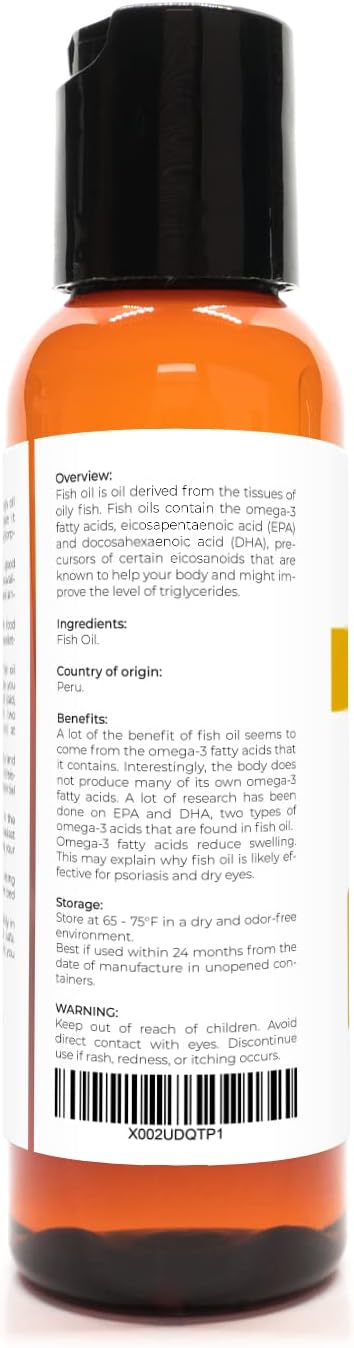 Fish oil is oil derived from the tissues of oily fish. Fish oils contain the omega-3 fatty acids, eicosapentaenoic acid (EPA) and docosahexaenoic acid (DHA), precursors of certain eicosanoids that are known to help your body and might raise the level of triglycerides. Product Specifications Common Name: Fish Oil Botanical Name: Engraulis Ringens Country of Origin: Peru Oil Color: Yellow Flavor / Odor / Aroma: Odorless Regardless of when you take fish oil, itâs important to take it alongside a meal to maximize its absorption in the body. In particular, taking fish oil with a good source of fat can increase the bioavailability of omega-3 fatty acids and enhance their effectiveness. Furthermore, taking fish oil with food may lower certain side effects associated with vitamins and minerals. Because most of the benefits of fish oil are associated with long-term use, you can take it at any time of day. That said, splitting your vitamins into two smaller doses in the morning and at night may help manage acid reflux. Finding a time that works for you and taking fish oil consistently is key to maximizing its potential benefits. For some, taking it first thing in the morning with breakfast is the easiest way to ensure that youâre getting your daily dose. 100% Pure & Natural Only One Ingredient: Our premium Fish Oil is 100% Pure & Natural â No Additives, No Chemicals, No Alcohol, No Fragrance, and Not Diluted. Non-GMO. Made without pesticides. Frequently Asked Questions Q: How much fish oil do I need? If fish is not a part of your normal diet, then you should take a fish oil daily that contains at least 900 mg of EPA and DHA. Q: How before I see results from omega-3 supplementation? The length of time it takes to see results depends on the dose, the individualâs diet, the target organ, and the age of the individual. The typical time frame before seeing results from omega-3 is anywhere from 1 to 3 months. Q: Fish oil pills vs liquid: Which one is better? Fish oil capsules contain less omega-3 than most people realize. To get an effective dose youâd need to consume between 8 -10 capsules daily. Using a liquid fish oil usually makes it easier for people to swallow an effective dose. Liquid fish oils are also more likely to be fresher than generic fish oil capsules since the manufacturer will typically pay more attention to the taste of the oil. (function(f) {var _np=(window.P._namespace("AplusModule"));if(_np.guardFatal){_np.guardFatal(f)(_np);}else{f(_np);}}(function(P) { // register javascript with unique module id P.when("jQuery", "AplusModules-module-6", "ready").execute(function($, hoverModule) { hoverModule("aplus-module-6-3"); }); })); Benefits & Uses Hydrate and soothe the skin Omega-3 may barrier function of the skin, locking in moisture and helping deal with red, itchy, and irritated skin. It might stimulate the growth of new cells, increase the elasticity of the skin, eliminate wrinkles and delay skin aging. Promote hair growth Fish oil provides essential proteins and nutrients to hair follicles, it increases circulation in the scalp that may trigger hair growth. Also, it can repair and strengthen damaged hair while adding shine and creating a silky texture. Omega-3 can help lock in moisture and give your hair a strong appearance, while also stimulating growth and decreasing scalp irritations. Promote the growth of shiny fur in dogs and cats Omega-3 fatty acids in fish oil can decrease itchy skin and dandruff. Fish oil is helpful in balancing skin moisture. It helps condition the skin, decreases scratching and hot spots, gives a shiny, smooth, and blooming coat, promotes joint, heart, cognitive well-being. Remember to always consult with the veterinarian before giving salmon oil to your pet. This is to ensure they are receiving the correct dose. Hydrate nails and soften cuticles Harsh nail products can cause nails to split and peel. Fish oil can help nourish the nails to make them stronger and less likely to split. Also, it might promote normal nail growth, moisturize the skin around nails and soften cuticles. Wild Alaskan Salmon Oil Lanolin Oil Sweet Almond Oil Amla Oil Jojoba Oil Pumpkin Seed Oil See Details Add to Cart See Details Add to Cart Add to Cart Add to Cart Customer Reviews .aplus-v2 .aplus-review-right-padding { padding-right: 0.1rem; } 3.7 out of 5 stars 12 .aplus-v2 .aplus-review-right-padding { padding-right: 0.1rem; } 4.7 out of 5 stars 1,504 .aplus-v2 .aplus-review-right-padding { padding-right: 0.1rem; } â .aplus-v2 .aplus-review-right-padding { padding-right: 0.1rem; } 4.6 out of 5 stars 3,949 .aplus-v2 .aplus-review-right-padding { padding-right: 0.1rem; } 4.6 out of 5 stars 3,949 .aplus-v2 .aplus-review-right-padding { padding-right: 0.1rem; } 4.6 out of 5 stars 3,949 Price â $30.46 $ 30 . 46 â $22.99 $ 22 . 99 $19.95 $ 19 . 95 $15.95 $ 15 . 95 100% Pure & Natural ? ? ? ? ? ? Best for Cats & Dogs Skin care Skin care Hair care Skin care Skin care Bottle Material Amber BPA-Free plastic Amber BPA-Free plastic Amber BPA-Free plastic Amber BPA-Free plastic Amber BPA-Free plastic Amber BPA-Free plastic Cold Pressed Unrefined ? ? ? ? Non-GMO ? ? ? ? ? ? At VELONA, we believe that natural products are the key to a happy life. We source only pure and high-quality ingredients and we stand behind every item that we make, 100% This product is considered the Non-GMO Product. Cruelty-Free & Vegan Not Tested on Animals. DISCLAIMER: Velona products are NOT MEDICAL PRODUCTS. All products are not considered as a treatment to heal, prevent, or cure any disease, health conditions, or problems. This information does not provide medical advice. It is intended for informational purposes only. Statements regarding dietary supplements have not been evaluated by the FDA and are not intended to diagnose, treat, cure, or prevent any disease or health condition