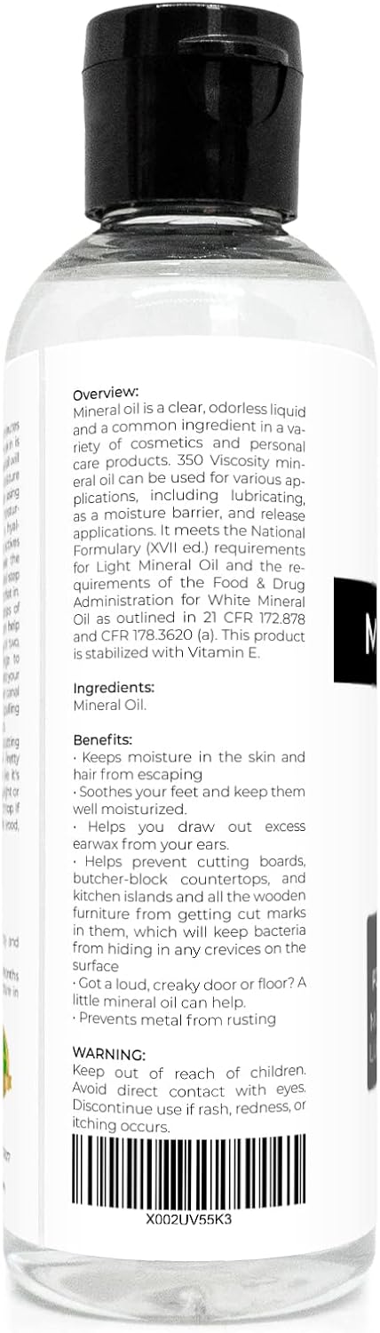 350 Viscosity Mineral Oil can be used for a variety of applications including lubricating, as a moisture barrier and for release applications. 350 Viscosity White Mineral Oil meets the requirements of the National Formulary (XVII ed.) for Light Mineral Oil and the requirements of the Food & Drug Administration for White Mineral Oil as set forth in 21 CFR 172.878 and CFR 178.3620 (a). This product is stabilized with vitamin E. Product Specifications Common Name: Mineral Oil Botanical Name: Liquid Paraffin Country of Origin: USA Extraction Method: Viscosity 350 Process Flow: Derived from petroleum oil Oil Color: Colorless Flavor / Odor / Aroma: Odorless and tasteless Apply mineral oil is a few minutes after showering, when the skin is slightly damp, since mineral oil will help lock some of the moisture into the skin. And if you're using any other products with moisturizing ingredients, such as hyaluronic acid, or protective actives such as antioxidants, make the mineral oil product the final step in your routine to seal all of that in. Applying two to three drops of mineral oil into the ear can help soften the wax. After a day or two, use a rubber bulb syringe to gently squirt warm water into your ear canal. Straighten the ear canal by tilting your head and pulling your outer ear up then back. 100% Pure & Natural Only One Ingredient: Our premium Mineral Oil is 100% Pure & Natural – No Additives, No Chemicals, No Alcohol, No Fragrance and Not Diluted. Non-GMO. Made without pesticides. Frequently Asked Questions Q: What are the ingredients in the composition? Only Mineral oil. Q: It is really comedogenic substance? The type of highly refined and purified mineral oil found in cosmetic and skincare products is noncomedogenic (does not clog pores). Q: What are storage and shelf life of mineral oil? Store at 65 - 75 °F in a dry and odor-free environment. Best if used within 24 months. Q: Where else can mineral oil be used? Mineral oil's ubiquity has led to its use in some niche applications as well: for treating and preserving wooden butcher block counter tops; as the principal fuel in some types of gel-type scented candles; as a brake fluid in some cars; for cooling etc. What are carrier oils? “Carrier Oil” is a term generally used in the contexts of aromatherapy and cosmetic recipes for natural skin and hair care. Carrier oils and essential oils are made from plants. Carrier oils are used to dilute essential oils and “carry” them to your skin. That’s because essential oils are potent and can cause irritation when applied directly to your skin. A Carrier Oil is a vital aspect of an aromatherapy massage or a natural cosmetic such as a soap, bath oil, body oil, cream, lip balm, lotion, or other moisturizer, as it can affect the usefulness of the massage and the color, scent, therapeutic properties, and shelf life of the final product, respectively. Most carrier oils are unscented or lightly scented and don’t interfere with an essential oil’s therapeutic properties. They may be used alone or with other oils to nourish your skin. Distillation of mineral oil Mineral oil is a colorless substance, a product of multi-stage oil processing. This oil is created by the distillation of crude oil, and from a chemical point of view, it is similar to petroleum jelly. Composed of long-chain hydrocarbons, there are different types in terms of density and viscosity. How is the oil prepared? Oil is exposed to catalysts, resulting in a carbonaceous mixture. Technical oil is formed from it. In the process of cleaning the oily liquid, all harmful substances are removed. (function(f) {var _np=(window.P._namespace("AplusModule"));if(_np.guardFatal){_np.guardFatal(f)(_np);}else{f(_np);}}(function(P) { // register javascript with unique module id P.when("jQuery", "AplusModules-module-6", "ready").execute(function($, hoverModule) { hoverModule("aplus-module-6-3"); }); })); Benefits & Uses Using in cosmetics It can be used on eyelashes to prevent brittleness and breaking and, in cold cream, is also used to remove crème make-up and temporary tattoos. Mineral oil is a common ingredient in baby lotions, cold creams, ointments, and cosmetics. Food preparation Mineral oil is a popular preservative for wooden cutting boards, salad bowls, and utensils. Periodically rubbing a small amount of mineral oil into a wooden kitchen item impedes absorption of food liquids, prevent cracks and splits from forming in wooden utensils. Mechanical, electrical, and industrial Mineral oil is used in a variety of industrial/mechanical capacities as a non-conductive coolant or thermal fluid in electric components, as it does not conduct electricity and functions to displace air and water. Mineral oil is used as a lubricant, a cutting fluid, and as a conditioning oil for jute fibres selected for textile production, a process known as 'jute batching'. Using in biomedicine Mineral oil is used in cell culture, veterinary and as a lubricant too. In the poultry industry, plain mineral oil can also be swabbed onto the feet of chickens infected with scaly mites on the shank, toes, and webs. It is also used along with a cotton swab to remove unshed skin (ashes) on reptiles such as lizards and snakes. Mineral Oil 70 Mineral Oil 90 Mineral Oil 350 Jojoba Oil Castor Oil Pumpkin Seed Oil See Details See Details See Details Add to Cart See Details Add to Cart Customer Reviews .aplus-v2 .aplus-review-right-padding { padding-right: 0.1rem; } 1.0 out of 5 stars 1 .aplus-v2 .aplus-review-right-padding { padding-right: 0.1rem; } — .aplus-v2 .aplus-review-right-padding { padding-right: 0.1rem; } — .aplus-v2 .aplus-review-right-padding { padding-right: 0.1rem; } 4.6 out of 5 stars 3,949 .aplus-v2 .aplus-review-right-padding { padding-right: 0.1rem; } — .aplus-v2 .aplus-review-right-padding { padding-right: 0.1rem; } 4.6 out of 5 stars 3,949 Price — — — $19.95 $ 19 . 95 — $15.95 $ 15 . 95 Pure & Natural ? ? ? ? ? ? Best for Lubrication Lu