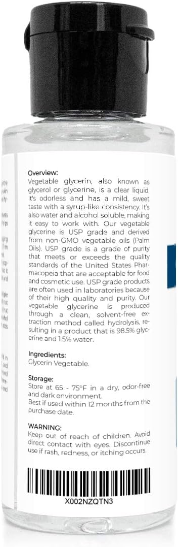 Vegetable glycerin, also known as glycerol or glycerine, is a clear liquid. It's odorless and has a mild, sweet taste with a syrup-like consistency. It’s also water and alcohol soluble, making it easy to work with. Our vegetable glycerine is USP grade and derived from non-GMO vegetable oils (Palm Oils). USP grade is a grade of purity that meets or exceeds the quality standards of the United States Pharmacopeia that are acceptable for food and cosmetic use. USP grade products are often used in laboratories because of their high quality and purity. Our vegetable glycerine is produced through a clean, solvent-free extraction method called hydrolysis, resulting in a product that is 98.5% glycerine and 1.5% water. IMPORTANT! We sell our products by weight, not by volume! That is, different kind of oils might have different volume while the same bottle size and weight as they have different viscosity. Product Specifications Common Name: Glycerin Country of Origin: Malaysia Grade: USP, Kosher, Food & Cosmetic Chemical formula: C3H8O3 Color: Clear transparent Vegetable glycerine is often found in toothpaste, hair care products, and shaving cream. Because it’s water and alcohol soluble, it mixes well in homemade creams and body sprays and sanitizers. 100% Pure Glycerol Glycerol is odourless, colorless, viscous in nature, and exists as a sweet tasting liquid. It can be derived naturally as well as from petrochemical feedstock. Glycerol has a wide variety of applications, and is one of the most valuable and versatile chemical substances in nature. It can be used as an emollient, solvent, sweetening agent, in pharmaceutical formulations, cosmetics, foodstuffs and toiletries. It is very stable and can be easily stored under normal temperature; also it is non-irritating and has no adverse impact to the environment. Frequently Asked Questions Q: What is vegetable glycerin Vegetable glycerine, also known as glycerol, is a transparent liquid usually made from soybean, coconut, or palm oils. It is odorless and has a moderate, sweet taste with a consistency that resembles syrup. Q: Can this be used in food Yes, it's food grade Glycerin, so it's safe for consuming internally and is often used in food industry. Q: Is it Halal Yes, Glycerin is halal as the fatty acid oleic acid is sourced from vegetable oils. Q: Is It Gluten free Yes, Glycerin is gluten free as it does not contain wheat, rye, barley, or crossbreeds of these grains. And can be used for people with celiac disease. Q: Is It Vegan Yes, it is vegan as the fatty acid – oleic acid derived from vegetable oils as no animal matter or products derived from animal used in the production. So it is suitable to add in the diet of vegetarians. Properties of Glycerol Glycerol is easily soluble in water, due to the ability of the polyol groups to form hydrogen bonds with water molecules. Glycerol is slightly denser than water with a specific gravity of 1.26. This means that when glycerol is poured into a container of water, it will sink to the bottom. However, due to its solubility, over time and with mild agitation, glycerol will form an aqueous solution. If a cosmetic preparation with high water content is applied on the skin, especially in arid environments, the presence of glycerol can prevent the lotion, cream or gel from drying out quickly. Other information Storage & Shelf Life: Store at 65 - 75°F in a dry and odor-free environment. Best if used within 12 months. GMO: Non GMO!!! This term shall be used to describe products that contain NO ingredients, additives or processing aides derived from commodities that have commercially grown GMO varieties in the supply chain (i.e. contains no soybean, corn, cotton, canola, squash, papaya, potato or tomato). (function(f) {var _np=(window.P._namespace("AplusModule"));if(_np.guardFatal){_np.guardFatal(f)(_np);}else{f(_np);}}(function(P) { // register javascript with unique module id P.when("jQuery", "AplusModules-module-6", "ready").execute(function($, hoverModule) { hoverModule("aplus-module-6-3"); }); })); Benefits & Uses Keeps skin young Applying glycerine to your skin traps moisture in your skin and gives it a youthful, healthy glow. By drawing moisture to the top layer of skin, glycerine helps reduce the appearance of wrinkles and keeps skin looking soft and smooth. Glycerine also improves skin function to slow down aging. For example, a study published in the Journal of Investigative Dermatology shows that glycerine may also help skin cells mature properly. Glycerine helps guide young skin cells from the deepest layers to the surface to form the skin's protective barrier. As a result, glycerine makes skin look, feel and function better overall. To reduce premature skin aging, the American Academy of Dermatology (AAD) recommends applying a facial moisturizer every day and cleaning your skin gently. They also recommend washing your face after sweating heavily and to discontinue using skin care products that burn or irritate your skin. Glycerine is the perfect ingredient for gentle cleaning and moisturizing. It's gentle Gentle cleansers and moisturizers are important for keeping skin comfortable and healthy, especially for individuals who are prone to acne. Acne-prone individuals are often told to use exfoliators to remove dead skin cells. Gritty, abrasive scrubs can remove dead skin cells and leave skin feeling soft, but they can also be too harsh for acne-prone skin and cause further irritation and redness where there's a breakout. Glycerine offers a gentle way to exfoliate, clean and moisturize skin without causing irritation. Individuals with acne want to remove dirt and oil when cleaning their skin, but they also want to make sure they're gentle with the outer layer of skin. Gentle cleansers that include glycerine are ideal for individuals with dry skin, as well. Protects skin During the winter, humidity levels drop outside, and cold air causes moisture in your skin to evaporate quickly. As a result