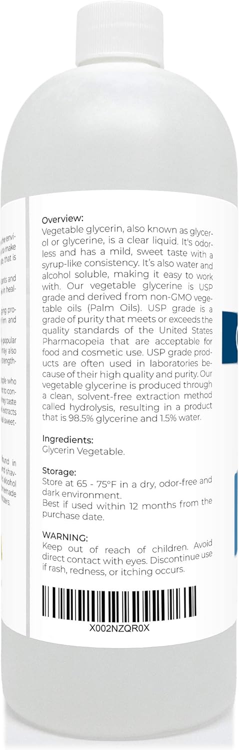 Vegetable glycerin, also known as glycerol or glycerine, is a clear liquid. It's odorless and has a mild, sweet taste with a syrup-like consistency. It’s also water and alcohol soluble, making it easy to work with. Our vegetable glycerine is USP grade and derived from non-GMO vegetable oils (Palm Oils). USP grade is a grade of purity that meets or exceeds the quality standards of the United States Pharmacopeia that are acceptable for food and cosmetic use. USP grade products are often used in laboratories because of their high quality and purity. Our vegetable glycerine is produced through a clean, solvent-free extraction method called hydrolysis, resulting in a product that is 98.5% glycerine and 1.5% water. IMPORTANT! We sell our products by weight, not by volume! That is, different kind of oils might have different volume while the same bottle size and weight as they have different viscosity. Product Specifications Common Name: Glycerin Country of Origin: Malaysia Grade: USP, Kosher, Food & Cosmetic Chemical formula: C3H8O3 Color: Clear transparent Vegetable glycerine is often found in toothpaste, hair care products, and shaving cream. Because it’s water and alcohol soluble, it mixes well in homemade creams and body sprays and sanitizers. 100% Pure Glycerol Glycerol is odourless, colorless, viscous in nature, and exists as a sweet tasting liquid. It can be derived naturally as well as from petrochemical feedstock. Glycerol has a wide variety of applications, and is one of the most valuable and versatile chemical substances in nature. It can be used as an emollient, solvent, sweetening agent, in pharmaceutical formulations, cosmetics, foodstuffs and toiletries. It is very stable and can be easily stored under normal temperature; also it is non-irritating and has no adverse impact to the environment. Frequently Asked Questions Q: What is vegetable glycerin Vegetable glycerine, also known as glycerol, is a transparent liquid usually made from soybean, coconut, or palm oils. It is odorless and has a moderate, sweet taste with a consistency that resembles syrup. Q: Can this be used in food Yes, it's food grade Glycerin, so it's safe for consuming internally and is often used in food industry. Q: Is it Halal Yes, Glycerin is halal as the fatty acid oleic acid is sourced from vegetable oils. Q: Is It Gluten free Yes, Glycerin is gluten free as it does not contain wheat, rye, barley, or crossbreeds of these grains. And can be used for people with celiac disease. Q: Is It Vegan Yes, it is vegan as the fatty acid – oleic acid derived from vegetable oils as no animal matter or products derived from animal used in the production. So it is suitable to add in the diet of vegetarians. Properties of Glycerol Glycerol is easily soluble in water, due to the ability of the polyol groups to form hydrogen bonds with water molecules. Glycerol is slightly denser than water with a specific gravity of 1.26. This means that when glycerol is poured into a container of water, it will sink to the bottom. However, due to its solubility, over time and with mild agitation, glycerol will form an aqueous solution. If a cosmetic preparation with high water content is applied on the skin, especially in arid environments, the presence of glycerol can prevent the lotion, cream or gel from drying out quickly. Other information Storage & Shelf Life: Store at 65 - 75°F in a dry and odor-free environment. Best if used within 12 months. GMO: Non GMO!!! This term shall be used to describe products that contain NO ingredients, additives or processing aides derived from commodities that have commercially grown GMO varieties in the supply chain (i.e. contains no soybean, corn, cotton, canola, squash, papaya, potato or tomato). (function(f) {var _np=(window.P._namespace("AplusModule"));if(_np.guardFatal){_np.guardFatal(f)(_np);}else{f(_np);}}(function(P) { // register javascript with unique module id P.when("jQuery", "AplusModules-module-6", "ready").execute(function($, hoverModule) { hoverModule("aplus-module-6-3"); }); })); Benefits & Uses Keeps skin young Applying glycerine to your skin traps moisture in your skin and gives it a youthful, healthy glow. By drawing moisture to the top layer of skin, glycerine helps reduce the appearance of wrinkles and keeps skin looking soft and smooth. Glycerine also improves skin function to slow down aging. For example, a study published in the Journal of Investigative Dermatology shows that glycerine may also help skin cells mature properly. Glycerine helps guide young skin cells from the deepest layers to the surface to form the skin's protective barrier. As a result, glycerine makes skin look, feel and function better overall. To reduce premature skin aging, the American Academy of Dermatology (AAD) recommends applying a facial moisturizer every day and cleaning your skin gently. They also recommend washing your face after sweating heavily and to discontinue using skin care products that burn or irritate your skin. Glycerine is the perfect ingredient for gentle cleaning and moisturizing. It's gentle Gentle cleansers and moisturizers are important for keeping skin comfortable and healthy, especially for individuals who are prone to acne. Acne-prone individuals are often told to use exfoliators to remove dead skin cells. Gritty, abrasive scrubs can remove dead skin cells and leave skin feeling soft, but they can also be too harsh for acne-prone skin and cause further irritation and redness where there's a breakout. Glycerine offers a gentle way to exfoliate, clean and moisturize skin without causing irritation. Individuals with acne want to remove dirt and oil when cleaning their skin, but they also want to make sure they're gentle with the outer layer of skin. Gentle cleansers that include glycerine are ideal for individuals with dry skin, as well. Protects skin During the winter, humidity levels drop outside, and cold air causes moisture in your skin to evaporate quickly. As a result