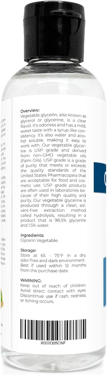 Vegetable glycerin, also known as glycerol or glycerine, is a clear liquid. It's odorless and has a mild, sweet taste with a syrup-like consistency. It’s also water and alcohol soluble, making it easy to work with. Our vegetable glycerine is USP grade and derived from non-GMO vegetable oils (Palm Oils). USP grade is a grade of purity that meets or exceeds the quality standards of the United States Pharmacopeia that are acceptable for food and cosmetic use. USP grade products are often used in laboratories because of their high quality and purity. Our vegetable glycerine is produced through a clean, solvent-free extraction method called hydrolysis, resulting in a product that is 98.5% glycerine and 1.5% water. IMPORTANT! We sell our products by weight, not by volume! That is, different kind of oils might have different volume while the same bottle size and weight as they have different viscosity. Product Specifications Common Name: Glycerin Country of Origin: Malaysia Grade: USP, Kosher, Food & Cosmetic Chemical formula: C3H8O3 Color: Clear transparent Vegetable glycerine is often found in toothpaste, hair care products, and shaving cream. Because it’s water and alcohol soluble, it mixes well in homemade creams and body sprays and sanitizers. 100% Pure Glycerol Glycerol is odourless, colorless, viscous in nature, and exists as a sweet tasting liquid. It can be derived naturally as well as from petrochemical feedstock. Glycerol has a wide variety of applications, and is one of the most valuable and versatile chemical substances in nature. It can be used as an emollient, solvent, sweetening agent, in pharmaceutical formulations, cosmetics, foodstuffs and toiletries. It is very stable and can be easily stored under normal temperature; also it is non-irritating and has no adverse impact to the environment. Frequently Asked Questions Q: What is vegetable glycerin Vegetable glycerine, also known as glycerol, is a transparent liquid usually made from soybean, coconut, or palm oils. It is odorless and has a moderate, sweet taste with a consistency that resembles syrup. Q: Can this be used in food Yes, it's food grade Glycerin, so it's safe for consuming internally and is often used in food industry. Q: Is it Halal Yes, Glycerin is halal as the fatty acid oleic acid is sourced from vegetable oils. Q: Is It Gluten free Yes, Glycerin is gluten free as it does not contain wheat, rye, barley, or crossbreeds of these grains. And can be used for people with celiac disease. Q: Is It Vegan Yes, it is vegan as the fatty acid – oleic acid derived from vegetable oils as no animal matter or products derived from animal used in the production. So it is suitable to add in the diet of vegetarians. Properties of Glycerol Glycerol is easily soluble in water, due to the ability of the polyol groups to form hydrogen bonds with water molecules. Glycerol is slightly denser than water with a specific gravity of 1.26. This means that when glycerol is poured into a container of water, it will sink to the bottom. However, due to its solubility, over time and with mild agitation, glycerol will form an aqueous solution. If a cosmetic preparation with high water content is applied on the skin, especially in arid environments, the presence of glycerol can prevent the lotion, cream or gel from drying out quickly. Other information Storage & Shelf Life: Store at 65 - 75°F in a dry and odor-free environment. Best if used within 12 months. GMO: Non GMO!!! This term shall be used to describe products that contain NO ingredients, additives or processing aides derived from commodities that have commercially grown GMO varieties in the supply chain (i.e. contains no soybean, corn, cotton, canola, squash, papaya, potato or tomato). (function(f) {var _np=(window.P._namespace("AplusModule"));if(_np.guardFatal){_np.guardFatal(f)(_np);}else{f(_np);}}(function(P) { // register javascript with unique module id P.when("jQuery", "AplusModules-module-6", "ready").execute(function($, hoverModule) { hoverModule("aplus-module-6-3"); }); })); Benefits & Uses Keeps skin young Applying glycerine to your skin traps moisture in your skin and gives it a youthful, healthy glow. By drawing moisture to the top layer of skin, glycerine helps reduce the appearance of wrinkles and keeps skin looking soft and smooth. Glycerine also improves skin function to slow down aging. For example, a study published in the Journal of Investigative Dermatology shows that glycerine may also help skin cells mature properly. Glycerine helps guide young skin cells from the deepest layers to the surface to form the skin's protective barrier. As a result, glycerine makes skin look, feel and function better overall. To reduce premature skin aging, the American Academy of Dermatology (AAD) recommends applying a facial moisturizer every day and cleaning your skin gently. They also recommend washing your face after sweating heavily and to discontinue using skin care products that burn or irritate your skin. Glycerine is the perfect ingredient for gentle cleaning and moisturizing. It's gentle Gentle cleansers and moisturizers are important for keeping skin comfortable and healthy, especially for individuals who are prone to acne. Acne-prone individuals are often told to use exfoliators to remove dead skin cells. Gritty, abrasive scrubs can remove dead skin cells and leave skin feeling soft, but they can also be too harsh for acne-prone skin and cause further irritation and redness where there's a breakout. Glycerine offers a gentle way to exfoliate, clean and moisturize skin without causing irritation. Individuals with acne want to remove dirt and oil when cleaning their skin, but they also want to make sure they're gentle with the outer layer of skin. Gentle cleansers that include glycerine are ideal for individuals with dry skin, as well. Protects skin During the winter, humidity levels drop outside, and cold air causes moisture in your skin to evaporate quickly. As a result