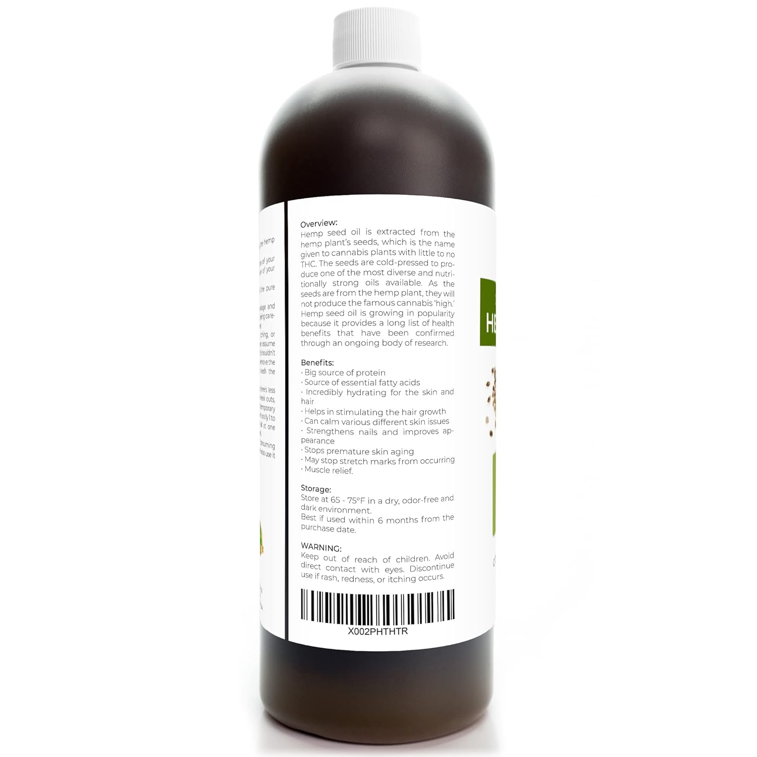 Hemp Seed Oil: 100% Pure and Natural Carrier Oil. Unrefined. Cold Pressed. Not Diluted, Non-GMO, No Additives, No Fragrance, Chemical Free, Alcohol Free. All our products are bottled in the USA